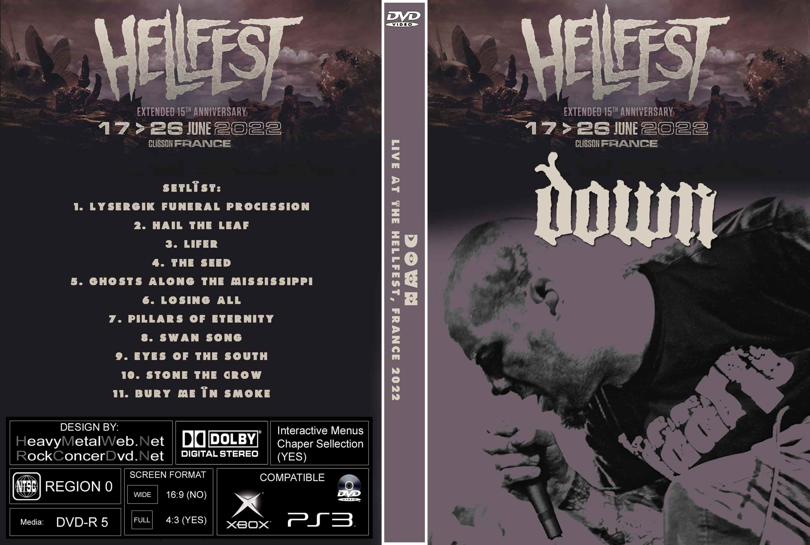 | DOWN Live At The Hellfest, France 2022 DVD DVD Format: NTSC Source: Professional Shot (Multi Camera) Video Quality: Rating: 9.0 Menus: No Chapter Selection: Every 5 Min Widescreen: Yes HD: Yes Total Running Time: 61 Min. SETLIST: 1. Lysergik Funeral Procession 2. Hail the Leaf 3. Lifer 4. The Seed 5. Ghosts Along the Mississippi 6. Losing All 7. Pillars of Eternity 8. Swan Song 9. Eyes of the South 10. Stone the Crow 11. Bury Me In Smoke |