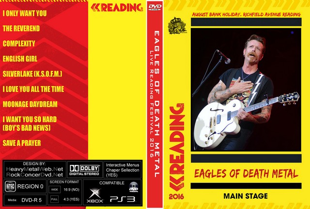 | EAGLES OF DEATH METAL Live Reading Festival 2016 DVD DVD Format: NTSC Source: Professional-Shot (Multi Camera) Video Quality: Rating: 9.0 Menus: No Chapter Sellection: Skip Every 5 Min. Widescreen: Yes Total Running Time: 42 Min. Setlist: 01. I Only Want You 02. The Reverend 03. Complexity (Boots Electric cover) 04. English Girl 05. Silverlake (K.S.O.F.M.) 06. I Love You All the Time 07. Moonage Daydream (David Bowie cover) 08. I Want You So Hard (Boy's Bad News) 09. Save a Prayer (Duran Duran cover) |