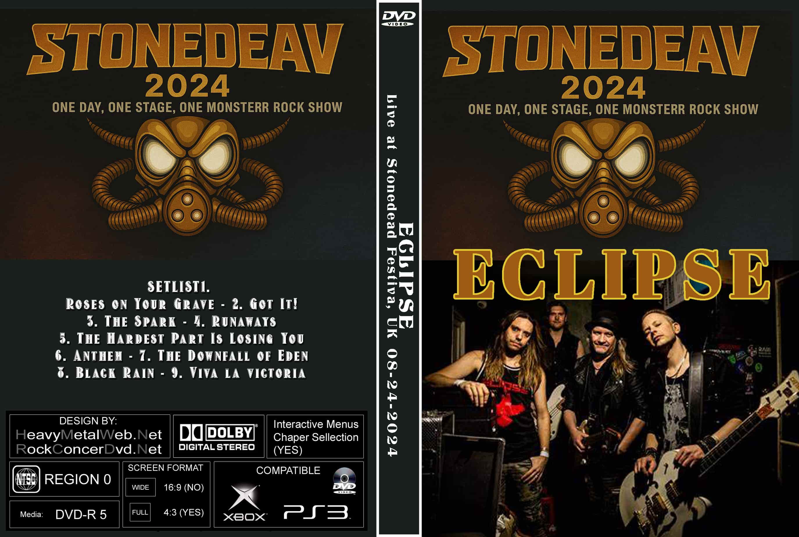 | ECLIPSE Live at Stonedead Festival, Newark-on-Trent, UK 08-24-2024 DVD DVD Format: NTSC Source: Professional Shot (Multi-Camera) Video Quality: Rating: 9.0 Menus: Yes Chapter Selection: Every 5 Min. WideScreen: Yes HD: Yes Total Running Time: Approx. 46 Min. SETLIST 1. Roses on Your Grave 2. Got It! 3. The Spark 4. Runaways 5. The Hardest Part Is Losing You 6. Anthem 7. The Downfall of Eden 8. Black Rain 9. Viva la victoria BAND LINEUP: Erik Mårtensson – Vocals, Guitar Magnus Henriksson – Guitar Victor Crusner – Bass Philip Crusner – Drums |