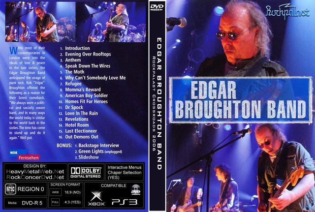 | EDGAR BROUGHTON BAND Rockpalast Crossroads 2006 DVD DVD Format: NTSC Source: Pro-Shot (Multi Camera) Video Quality: Rating: 8.5 Menus: No Chapter Selection: Every 5 Min. Widescreen: Yes HD: Yes Total Running Time: 73 Min. SETLIST: 01. Evening Over Rooftops 02. Anthem 03. Call Me A Liar 04. Speak Down The Wires 05. The Moth 06. Why Can't Somebody Love Me 07. The Refugee 08. Momma's Reward 09. American Boy Soldier 10. Homes Fit For Heroes 11. Dr Spock 12. Love In The Rain 13. Revelations 14. Hotel Room 15. Last Electioneer 16. Out Demons Out |