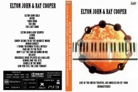 | ELTON JOHN & RAY COOPER Live At The Greek Theater, Los Angeles 09-22-1994 DVD (REMASTERED) DVD Format: NTSC Source: Professional Shot (Multi- Camera) Video Quality: Rating: 9.0 Menus: No Chapter Selection: Skip Avery 5 Min Full Screen: Yes HD: No Total Running Time: 89 Min. SETLIST: ELTON JOHN SOLO Intro Your Song The One The Last Song ELTON JOHN & RAY COOPER Levon Daniel Sorry Seems To Be The Hardest Word Indian Sunset I Think I'm Gonna To Kill Myself Take Me To The Pilot Don't Let The Sun Go Down On Me Believe Crocodile Rock (Played as a ballad) Bennie And The Jets Candle In The Wind Can You Feel The Love Tonight |