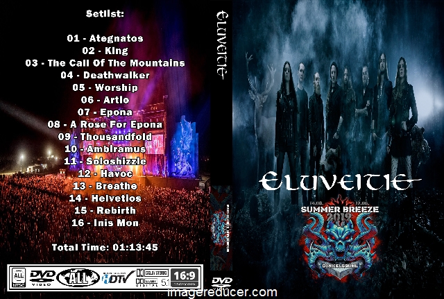 | ELUVEITIE Live At Summer Breeze, Germany 2019 DVD DVD Format: NTSC Source: Pro-Shot (Multi Camera) Video Quality: Rating: 9.0 Menus: Yes Chapter Selection: Yes Widescreen: Yes HD: Yes Total Running Time: 73 Min. SETLIST: 01 - Ategnatos 02 - King 03 - The Call Of The Mountains 04 - Deathwalker 05 - Worship 06 - Artio 07 - Epona 08 - A Rose For Epona 09 - Thousandfold 10 - Ambiramus 11 - Soloshizzle 12 - Havoc 13 - Breathe 14 - Helvetios 15 - Rebirth 16 - Inis Mon |
