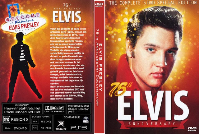 | ELVIS PRESLEY 75th Anniversary Documentary (5 DVDs) DVD Format: NTSC Source: Pro-Shot (Multi Camera) Video Quality: Rating: 8.5 Menus: Yes Chapter Selection: Yes Widescreen: No HD: No Total Running Time: 479 Min. TRACKLIST: This documentary runs from his beginnings in Tupelo, follows through his military service and concludes in his final years. |