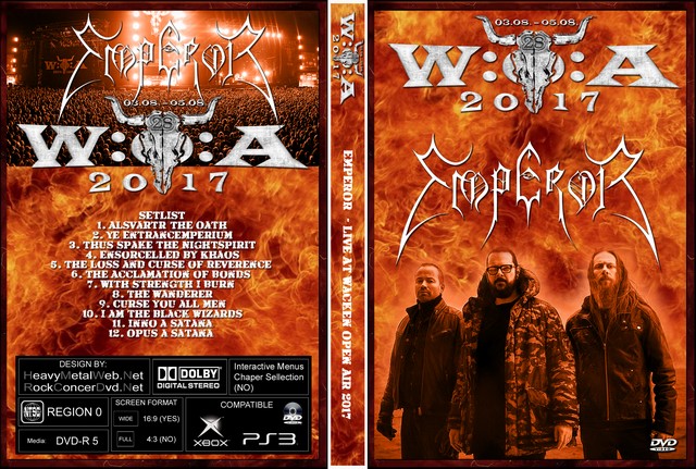 | EMPEROR Live At Wacken Open Air 2017 DVD DVD Format: NTSC Source: Pro-Shot (Multi Camera) Video Quality: Rating: 9.0 Menus: Yes Chapter Selection: Yes Widescreen: Yes HD: Yes Total Running Time: 65 Min. SETLIST: 1. Alsvartr (The Oath) 2. Ye Entrancemperium 3. Thus Spake the Nightspirit 4. Ensorcelled by Khaos 5. The Loss and Curse of Reverence 6. The Acclamation of Bonds 7. With Strength I Burn 8. The Wanderer 9. Curse you all men 10. I am the black wizards 11. Inno a satana 12. Opus a satana |