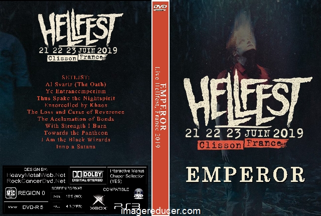 | EMPEROR Live Hellfest, France 2019 DVD DVD Format: NTSC Source: Pro-Shot (Multi Camera) Video Quality: Rating: 9.0 Menus: No Chapter Selection: Every 5 Min Widescreen: Yes HD: Yes Total Running Time: 61 Min. SETLIST: Al Svartr (The Oath) Ye Entrancemperium Thus Spake the Nightspirit Ensorcelled by Khaos The Loss and Curse of Reverence The Acclamation of Bonds With Strength I Burn Towards the Pantheon I Am the Black Wizards Inno a Satana |