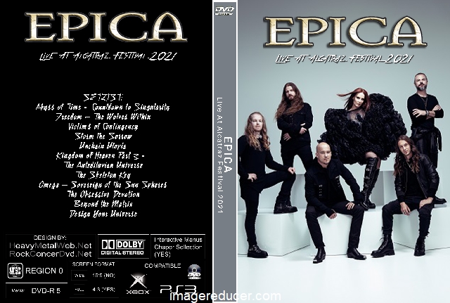 | EPICA Live At Alcatraz Festival 2021 DVD DVD Format: NTSC Source: Professional Shot (Multi Camera) Video Quality: Rating: 9.0 Menus: No Chapter Selection: Every 5 Min Widescreen: Yes HD: Yes Total Running Time:80 Min. SETLIST: Abyss of Time – Countdown to Singularity Freedom – The Wolves Within Victims of Contingency Storm the Sorrow Unchain Utopia Kingdom of Heaven Part 3 – The Antediluvian Universe The Skeleton Key Omega – Sovereign of the Sun Spheres The Obsessive Devotion Beyond the Matrix Design Your Universe |