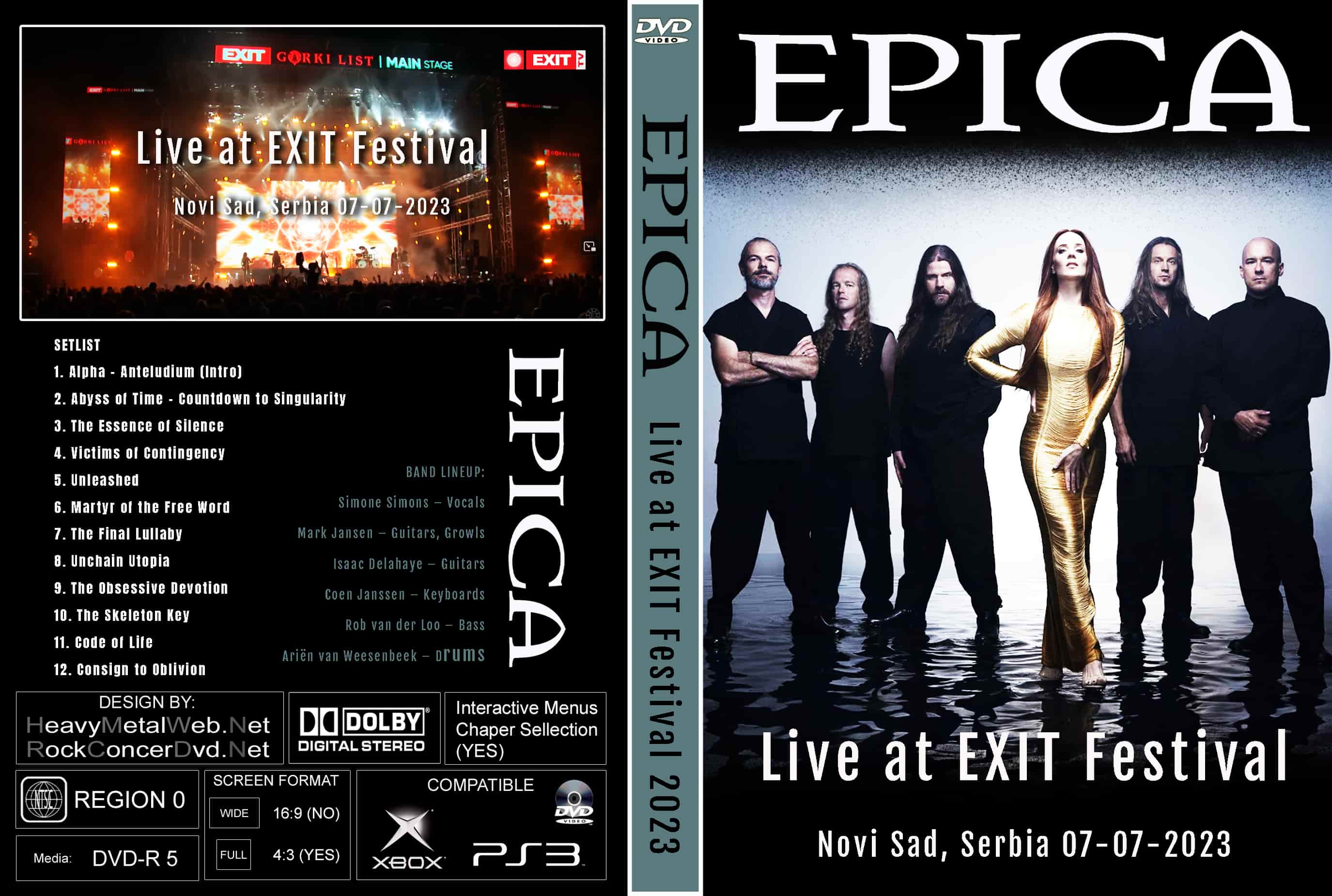 | EPICA Live at EXIT Festival, Novi Sad, Serbia 07-07-2023 DVD DVD Format: NTSC Source: Professional Shot (Multi-Camera) Video Quality: Rating: 9.0 Menus: Yes Chapter Selection: Every 5 Min. WideScreen: Yes HD: Yes Total Running Time: Approx. 74 Min. SETLIST 1. Alpha – Anteludium (Intro) 2. Abyss of Time – Countdown to Singularity 3. The Essence of Silence 4. Victims of Contingency 5. Unleashed 6. Martyr of the Free Word 7. The Final Lullaby 8. Unchain Utopia 9. The Obsessive Devotion 10. The Skeleton Key 11. Code of Life 12. Consign to Oblivion BAND LINEUP: Simone Simons – Vocals Mark Jansen – Guitars, Growls Isaac Delahaye – Guitars Coen Janssen – Keyboards Rob van der Loo – Bass Ariën van Weesenbeek – Drums |