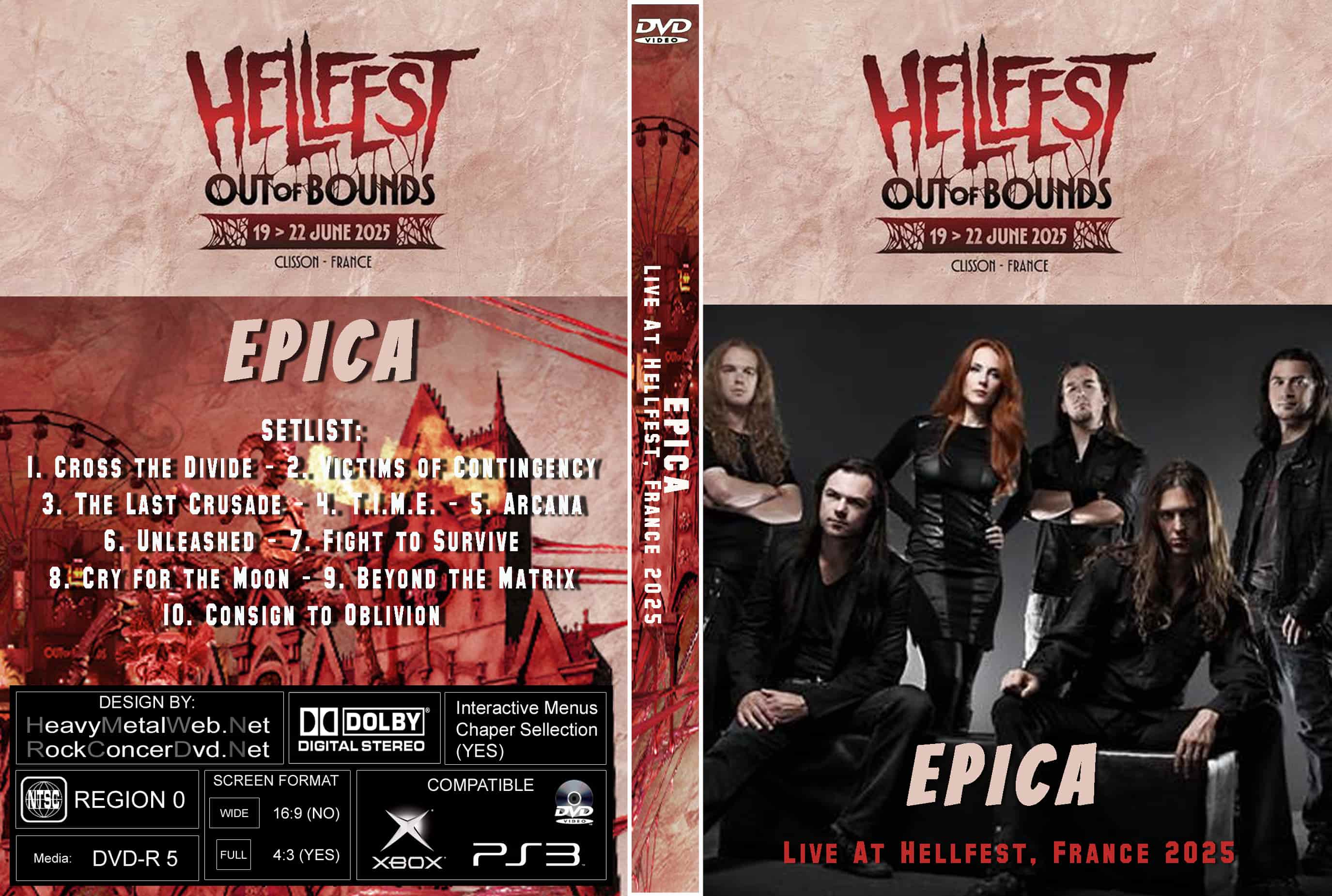 | EPICA Live At Hellfest, France 06-20-2025 DVD DVD Format: NTSC Source: Professional Shot (Multi‑Camera) Video Quality: Rating: 9.0, HD, Widescreen Menus: No Chapter Selection: Every 5 Min. Total Running Time: 60 Min SETLIST: 1. Cross the Divide 2. Victims of Contingency 3. The Last Crusade 4. T.I.M.E. 5. Arcana 6. Unleashed 7. Fight to Survive 8. Cry for the Moon 9. Beyond the Matrix 10. Consign to Oblivion |