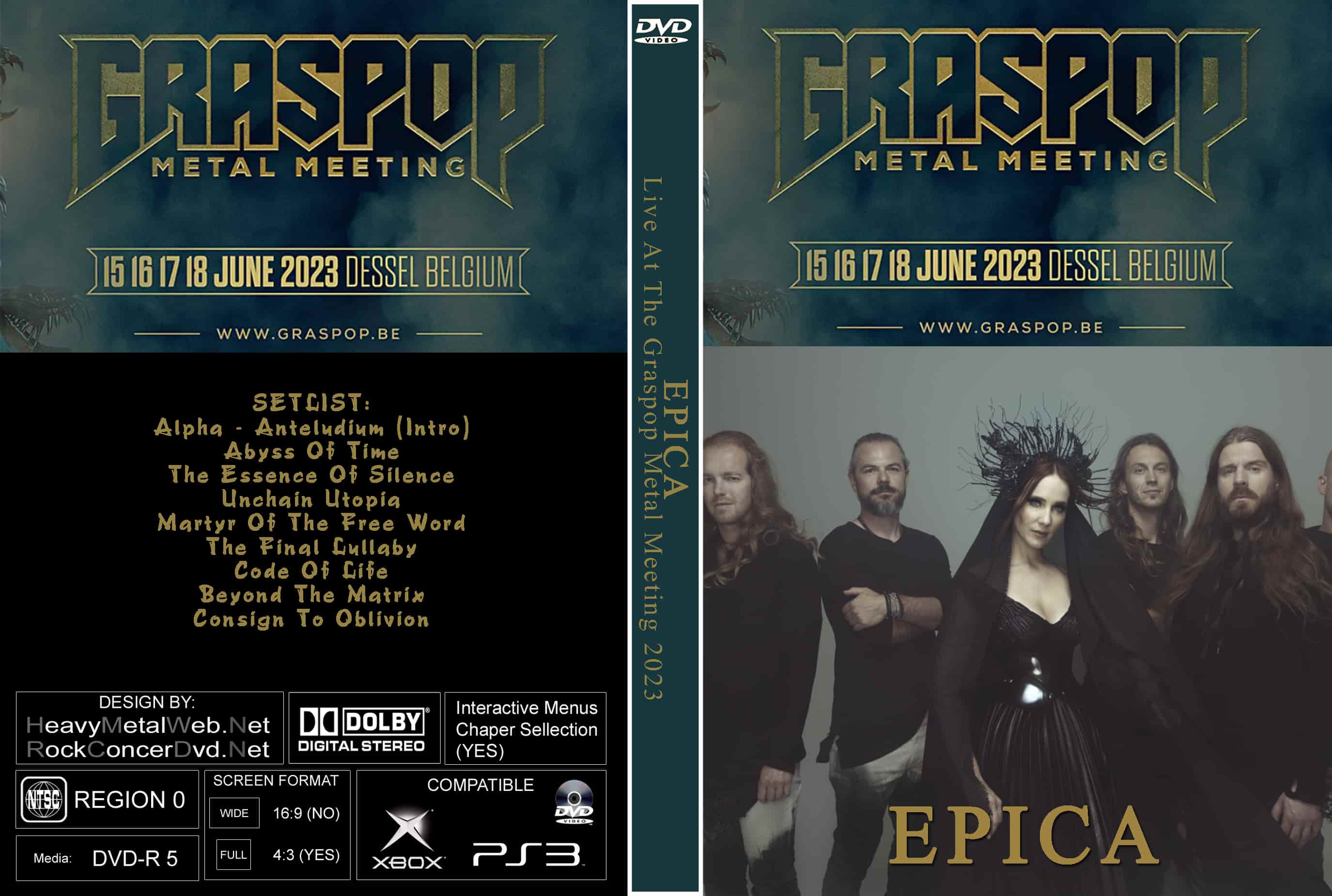 | EPICA Live At The Graspop Metal Meeting 2023 DVD DVD Format: NTSC Source: Professional Shot (Multi- Camera) Video Quality: Rating: 8.5 Menus: No Chapter Selection: Skip Avery 5 Min WideScreen: Yes HD: No Total Running Time: 50 Min. SETLIST: Alpha - Anteludium (Intro) Abyss Of Time The Essence Of Silence Unchain Utopia Martyr Of The Free Word The Final Lullaby Code Of Life Beyond The Matrix Consign To Oblivion |