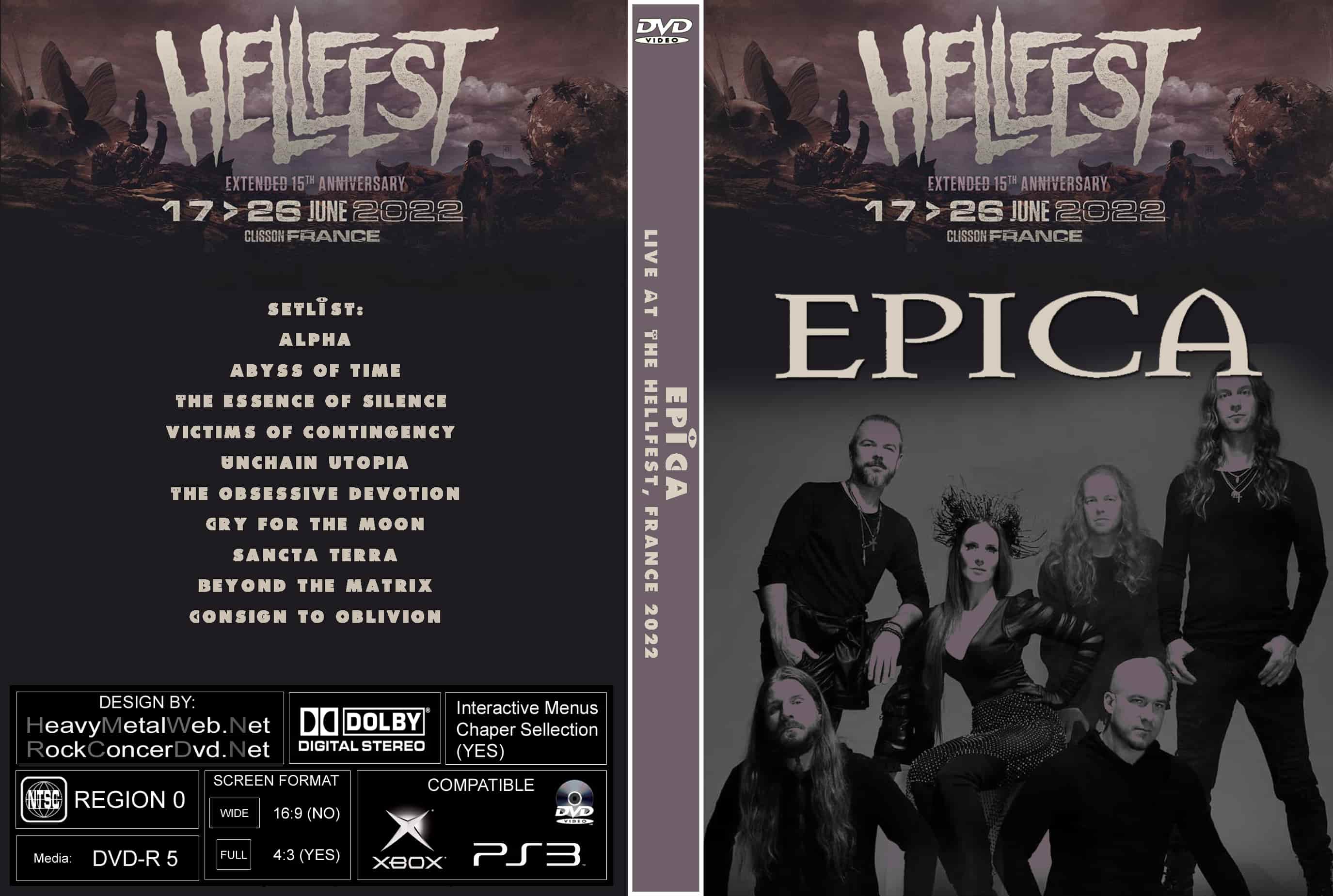 | EPICA Live At The Hellfest, France 2022 DVD DVD Format: NTSC Source: Professional Shot (Multi Camera) Video Quality: Rating: 9.0 Menus: No Chapter Selection: Every 5 Min Widescreen: Yes HD: Yes Total Running Time: 59 Min. SETLIST: Alpha Abyss of time The essence of silence Victims of contingency Unchain utopia The obsessive devotion Cry for the moon Sancta terra Beyond the matrix Consign to oblivion |