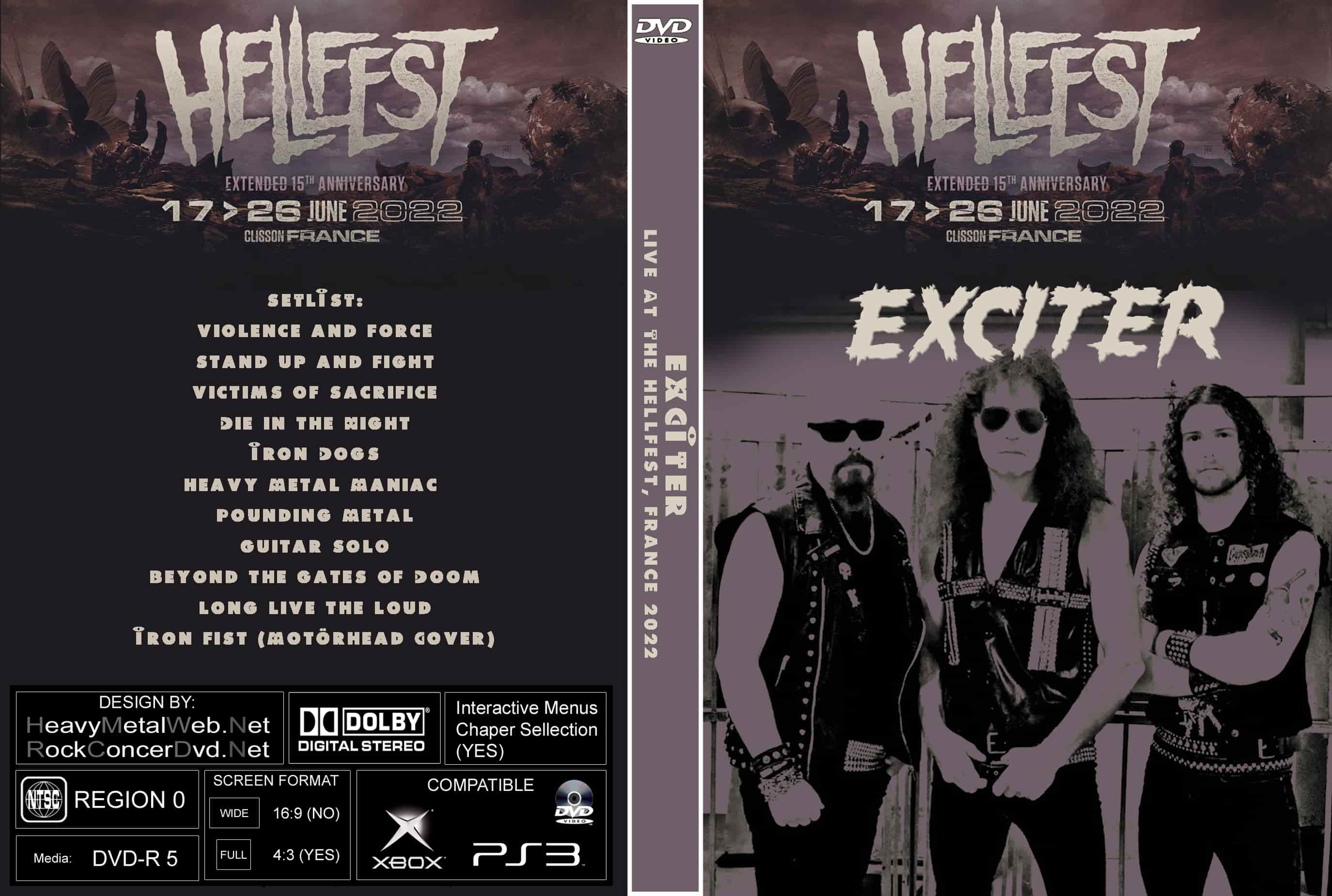 | EXCITER Live At The Hellfest, France 2022 DVD DVD Format: NTSC Source: Professional Shot (Multi Camera) Video Quality: Rating: 9.0 Menus: No Chapter Selection: Every 5 Min Widescreen: Yes HD: Yes Total Running Time: 48 Min. SETLIST: Violence and Force Stand up and Fight Victims of Sacrifice Die in the Night Iron Dogs Heavy Metal Maniac Pounding Metal Guitar Solo Beyond the Gates of Doom Long Live the Loud Iron Fist (Motörhead Cover) |