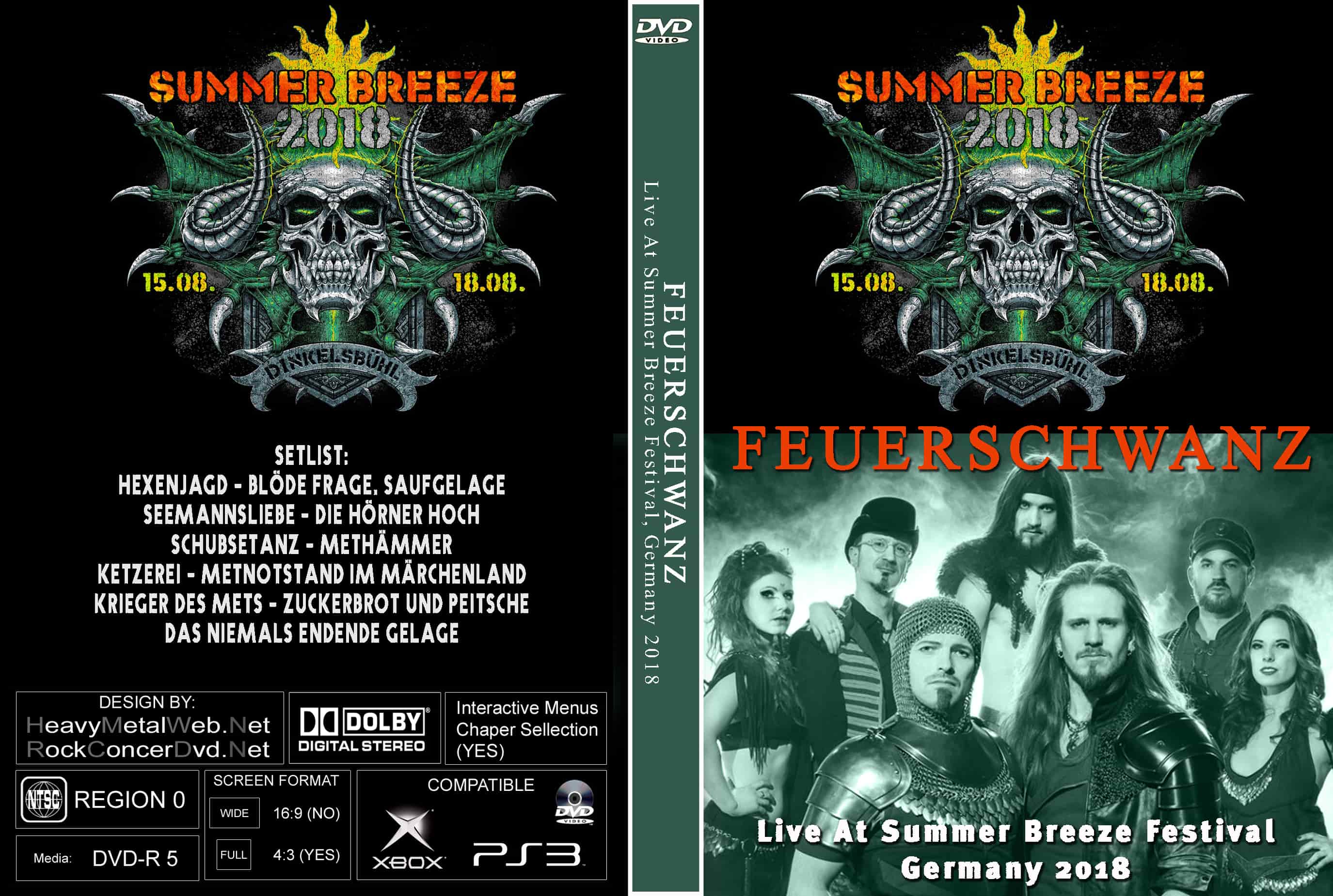 | FEUERSCHWANZ Live At Summer Breeze Festival, Germany 2018 DVD DVD Format: NTSC Source: Professional Shot (Multi Camera) Video Quality: Rating: 9.0 Menus: No Chapter Selection: Every 5 Min Full Screen: Yes HD: Yes Total Running Time: 58 Min. SETLIST: Hexenjagd Blöde Frage, Saufgelage Seemannsliebe Die Hörner hoch Schubsetanz Methämmer Ketzerei Metnotstand im Märchenland Krieger des Mets Zuckerbrot und Peitsche Das niemals endende Gelage |