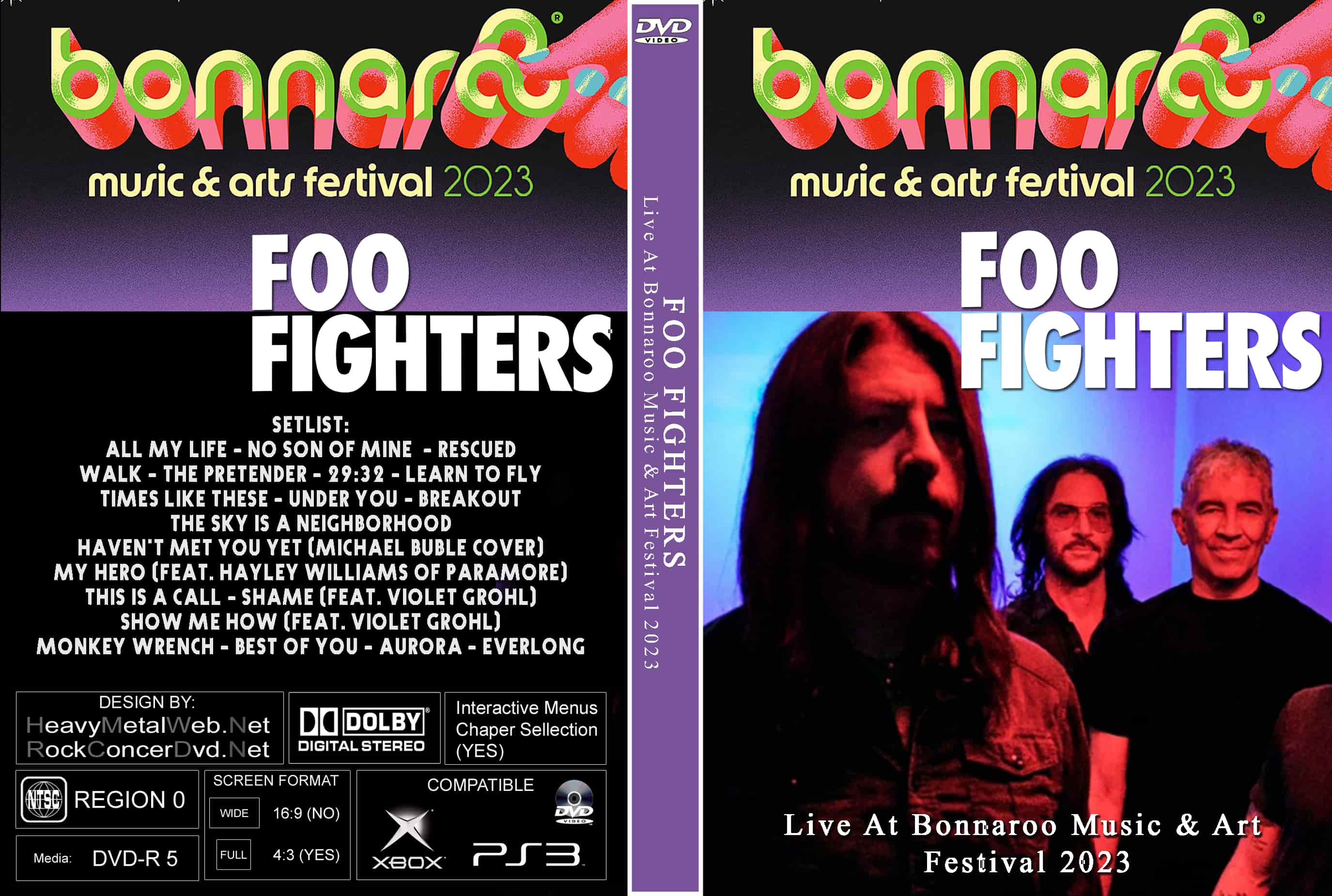 | FOO FIGHTERS Live At Bonnaroo Music & Art Festival 2023 ( 2 DVDs) DVD Format: NTSC Source: Professional Shot (Multi- Camera) Video Quality: Rating: 9.0 Menus: No Chapter Selection: Skip Avery 5 Min WideScreen: Yes HD: Yes Total Running Time: 117 Min. SETLIST: All My Life No Son of Mine Rescued Walk The Pretender 29:32 - Learn To Fly Times Like These Under You Breakout The Sky Is A Neighborhood Haven't Met You Yet (Michael Buble cover) My Hero (feat. Hayley Williams of Paramore) This Is A Call Shame (feat. Violet Grohl) Show Me How (feat. Violet Grohl) Monkey Wrench Best of You Aurora Everlong |