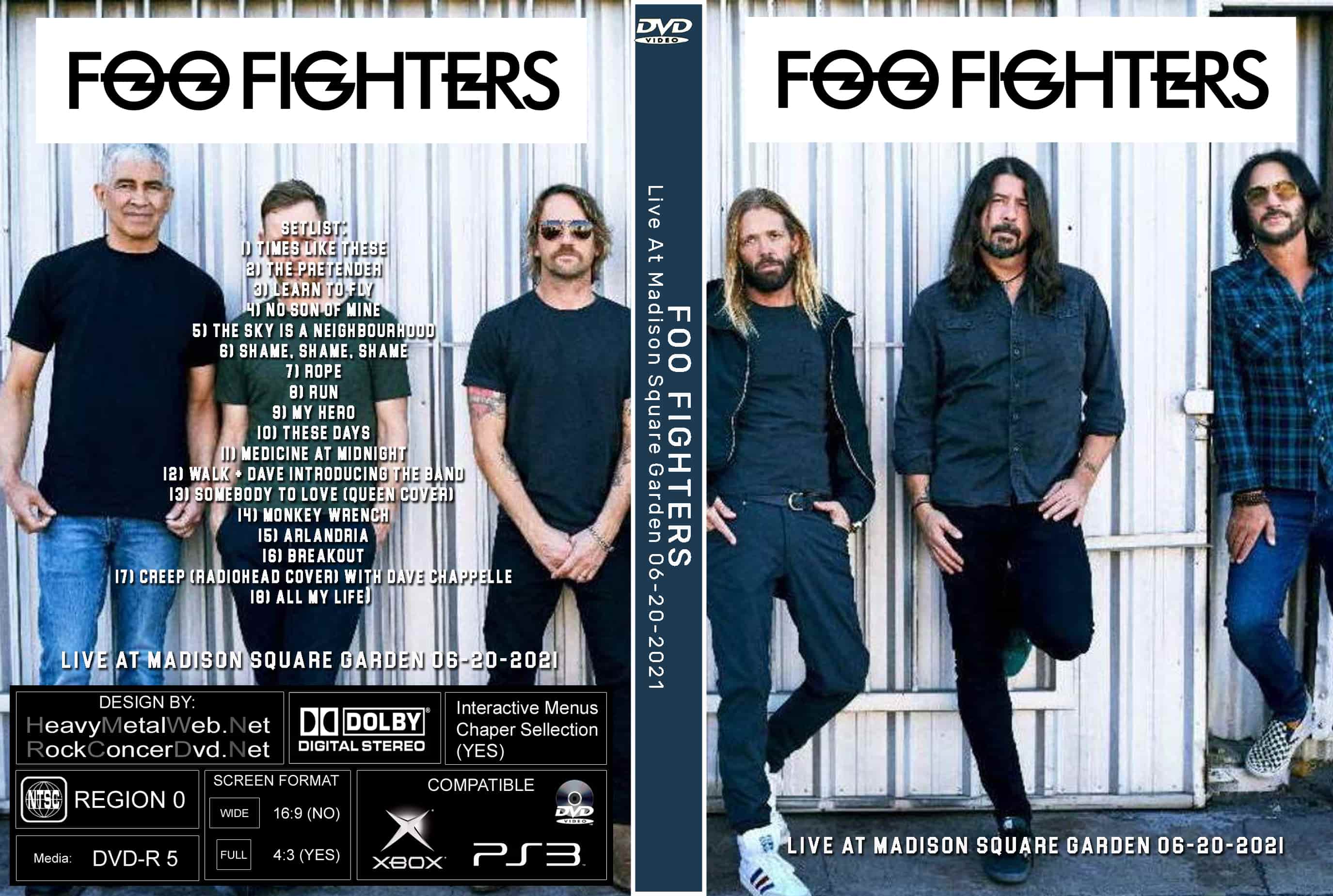 | FOO FIGHTERS Live At Madison Square Garden 06-20-2021 (2 DVDs) DVD Format: NTSC Source: Professional Shot (Multi Camera) Video Quality: Rating: 9.0 Menus: No Chapter Selection: Every 5 Min Widescreen: Yes HD: Yes Total Running Time: 166 Min. SETLIST: 1) Times Like These 2) The Pretender 3) Learn to Fly 4) No Son of Mine 5) The Sky is a Neighbourhood 6) Shame, Shame, Shame 7) Rope 8) Run 9) My Hero 10) These Days 11) Medicine at Midnight 12) Walk + Dave introducing the band 13) Somebody to Love (Queen Cover) 14) Monkey Wrench 15) Arlandria 16) Breakout 17) Creep (Radiohead Cover) with Dave Chappelle 18) All My Life |