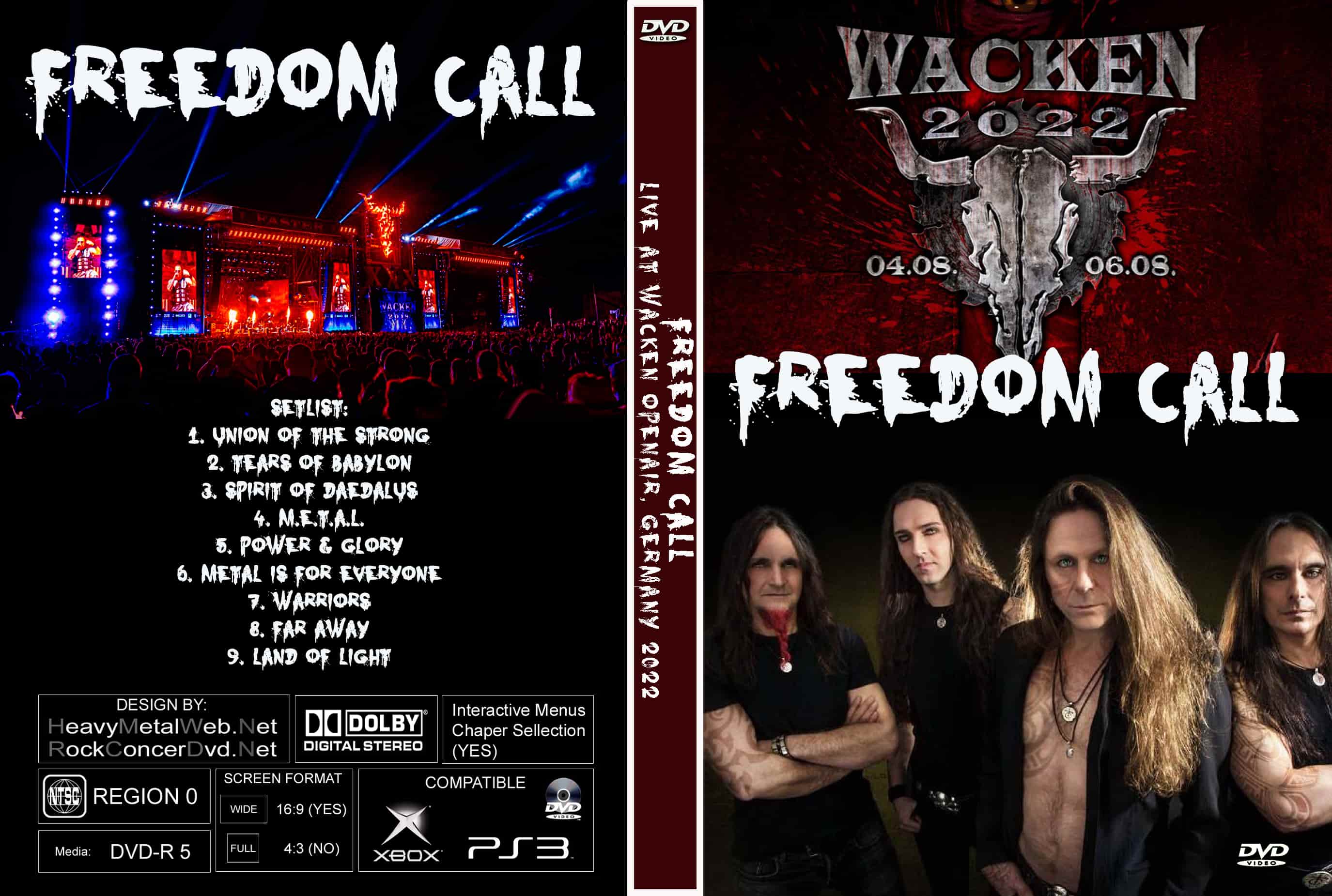 | FREEDOM CALL Live Wacken Open Air, Germany 2022 DVD DVD Format: NTSC Source: Professional Shot (Multi Camera) Video Quality: Rating: 9.0 Menus: No Chapter Selection: Every 5 Min Widescreen: Yes HD: Yes Total Running Time: 48 Min. SETLIST: 1. Union of the Strong 2. Tears of Babylon 3. Spirit of Daedalus 4. M.E.T.A.L. 5. Power & Glory 6. Metal Is for Everyone 7. Warriors 8. Far Away 9. Land of Light |