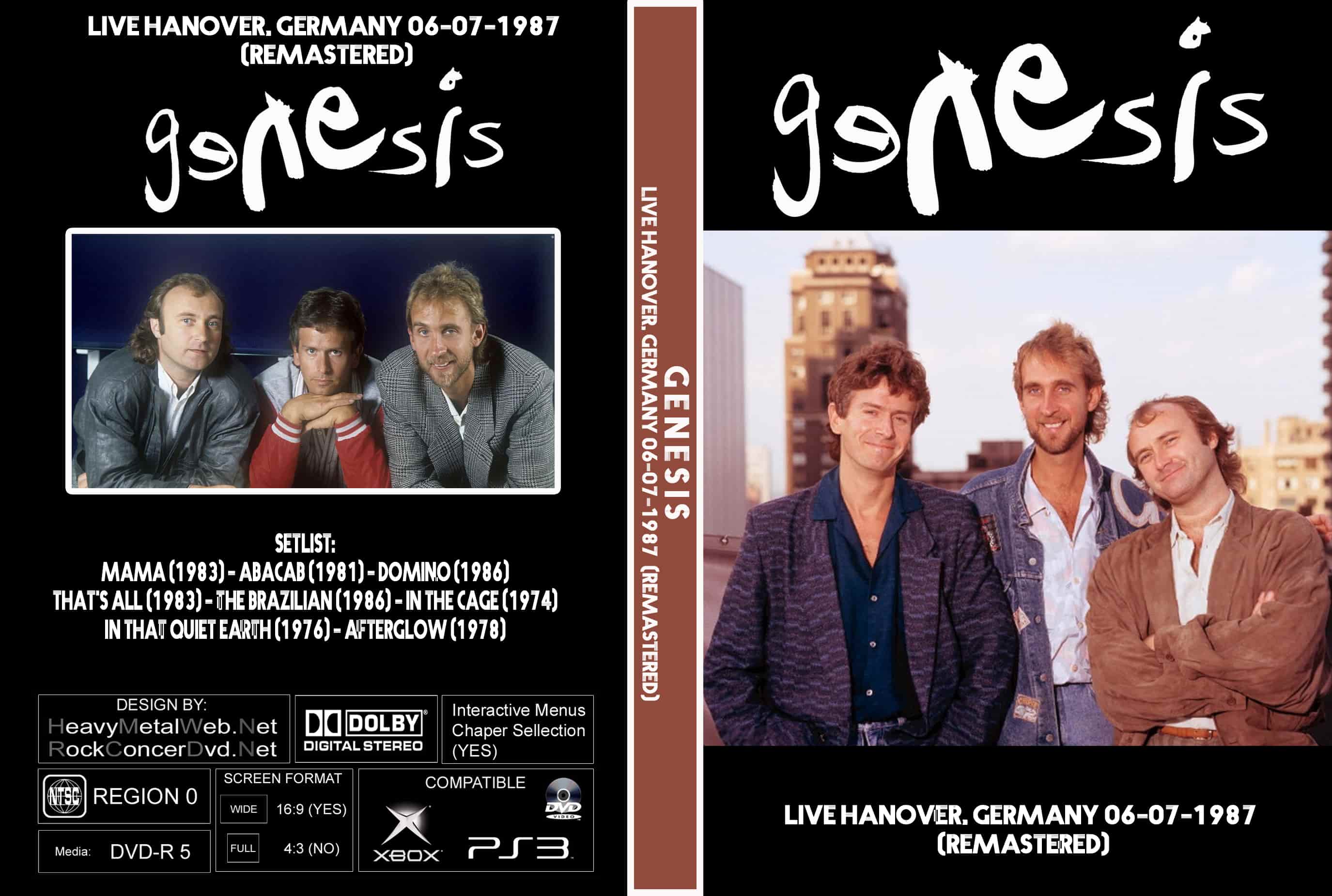 | GENESIS Live Hanover, Germany 06-07-1987 DVD (REMASTERED) DVD Format: NTSC Source: Professional Shot (Multi Camera) Video Quality: Rating: 9.0 Menus: No Chapter Selection: Every 5 Min Widescreen: Yes HD: Yes Total Running Time: 114 Min. SETLIST: Mama (1983) Abacab (1981) Domino (1986) That's All (1983) The Brazilian (1986) In The Cage (1974) In That Quiet Earth (1976) Afterglow (1978) |