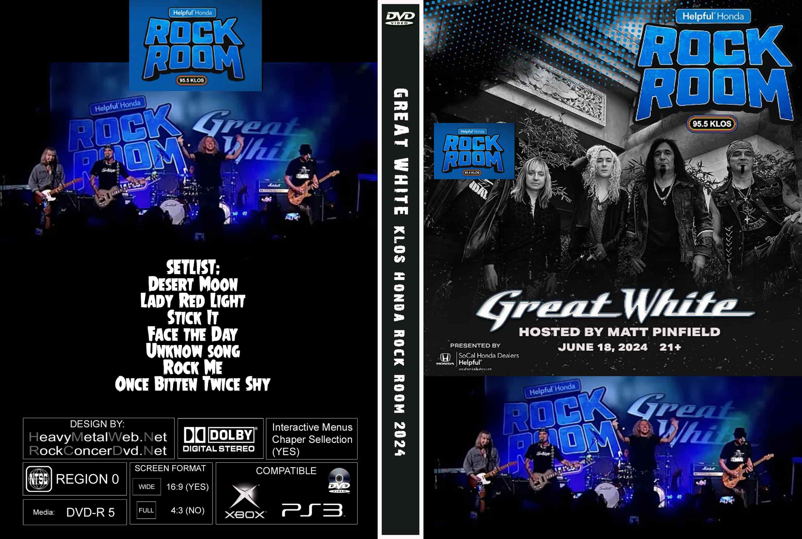 | GREAT WHITE KLOS Honda Rock Room 2024 DVD DVD Format: NTSC Source: Professional Shot (Multi- Camera) Video Quality: Rating: 9.0 Menus: Yes Chapter Selection: Every 5 Min. WideScreen: Yes HD: Yes Total Running Time: 44 Min. SETLIST: Desert Moon Lady Red Light Stick It Face the Day Unknow song Rock Me Once Bitten Twice Shy |