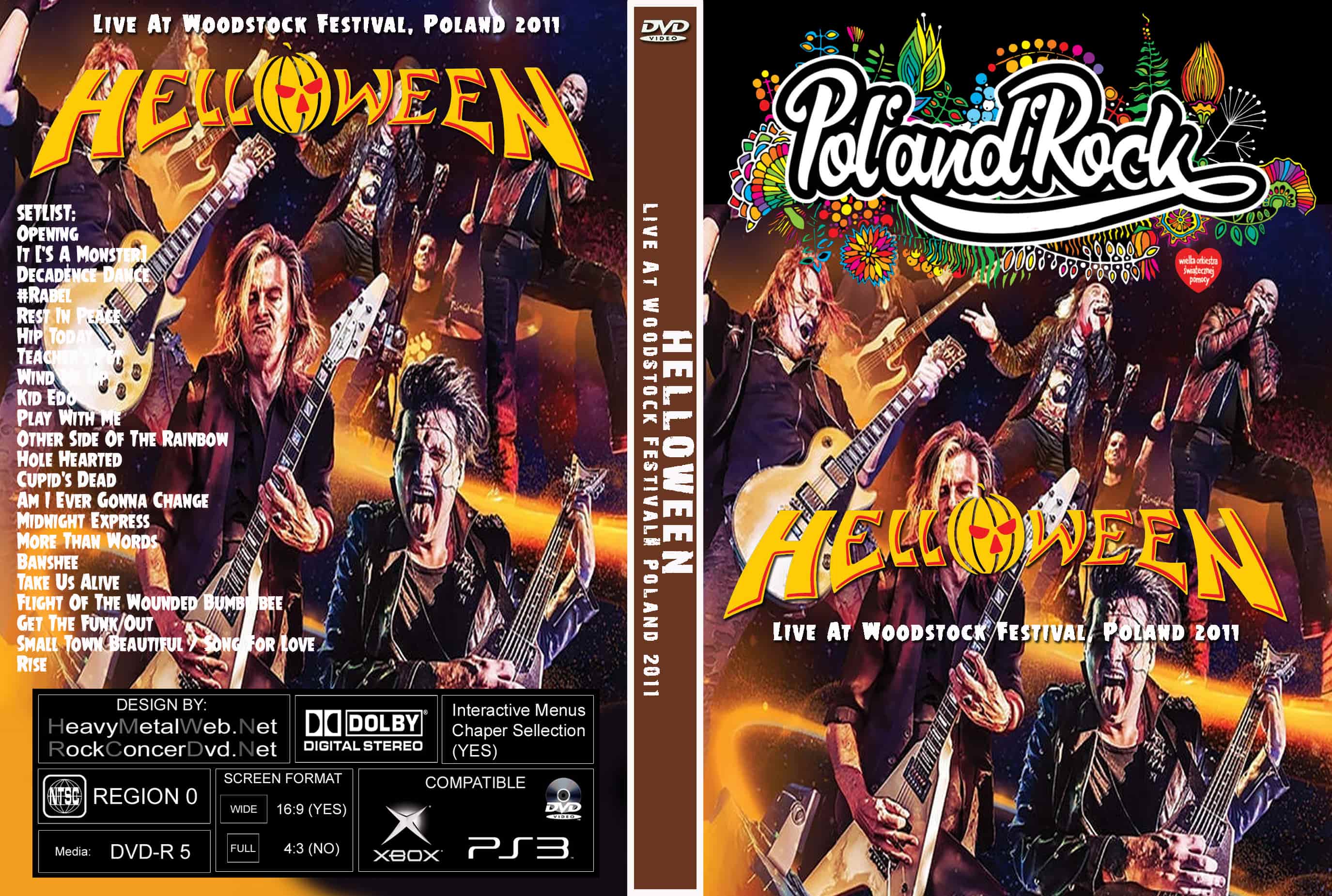 | HELLOWEEN Live At Woodstock Festival, Poland 2011 DVD DVD Format: NTSC Source: Professional Shot (Multi- Camera) Video Quality: Rating: 9.0 Menus: Yes Chapter Selection: Every 5 Min. WideScreen: Yes HD: Yes Total Running Time: 76 Min. SETLIST: (Intro) Who Is Mr. Madman? / Starlight / Are You Metal? Are You Metal? Eagle Fly Free March Of Time Where the Sinners Go Drum Solo If I Could Fly Keeper of the Seven Keys / The King for a 1000 Years / Halloween (Medley) Future World Dr. Stein I Want Out |