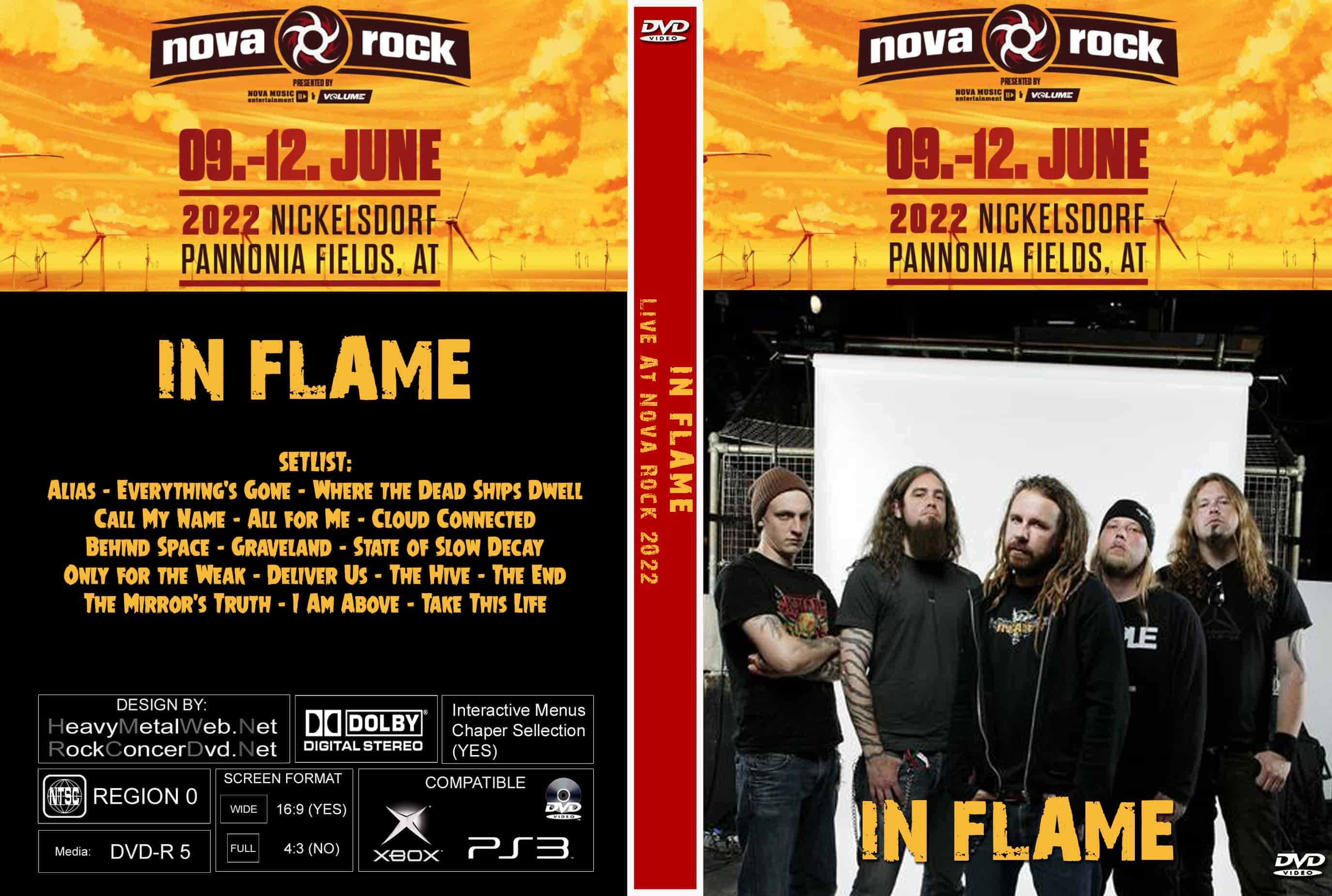 | IN FLAME Live At Nova Rock 2022 DVD DVD Format: NTSC Source: Professional Shot (Multi Camera) Video Quality: Rating: 7.5 (Web Quality) Menus: No Chapter Selection: Every 5 Min Widescreen: Yes HD: No Total Running Time: 69 Min. SETLIST: Alias Everything's Gone Where the Dead Ships Dwell Call My Name All for Me Cloud Connected Behind Space Graveland State of Slow Decay Only for the Weak Deliver Us The Hive The End The Mirror's Truth I Am Above Take This Life |