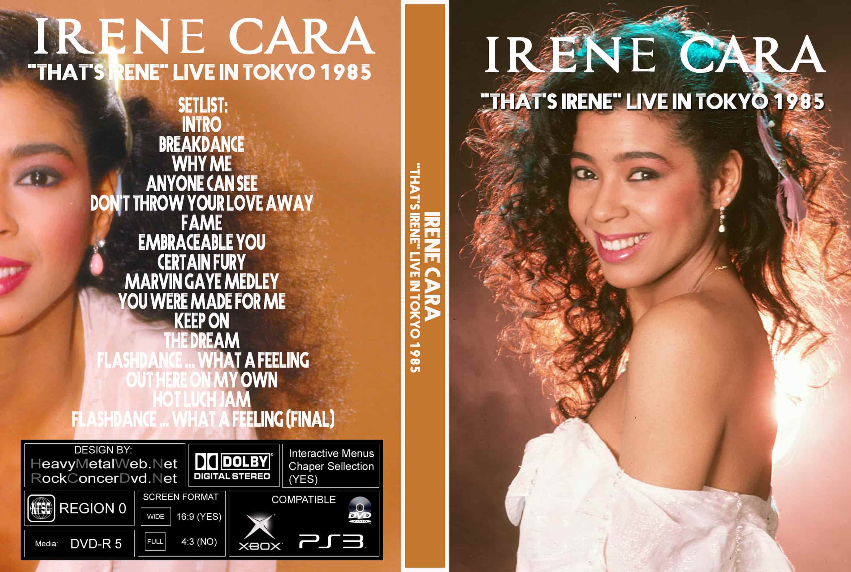 | IRENE CARA "That's Irene" Live In tokyo 1985 DVD DVD Format: NTSC Source: Professional Shot (Multi Camera) Video Quality: Rating: 8.0 Menus: No Chapter Selection: Every 5 Min Full Screen: Yes HD: No Total Running Time: 75 Min. SETLIST: Intro Breakdance Why Me Anyone Can See Don't throw Your Love Away Fame Embraceable You Certain Fury Marvin Gaye Medley You Were Made For Me Keep On The Dream Flashdance ... What a Feeling Out Here On My Own Hot Luch Jam Flashdance ... What a Feeling (final) |