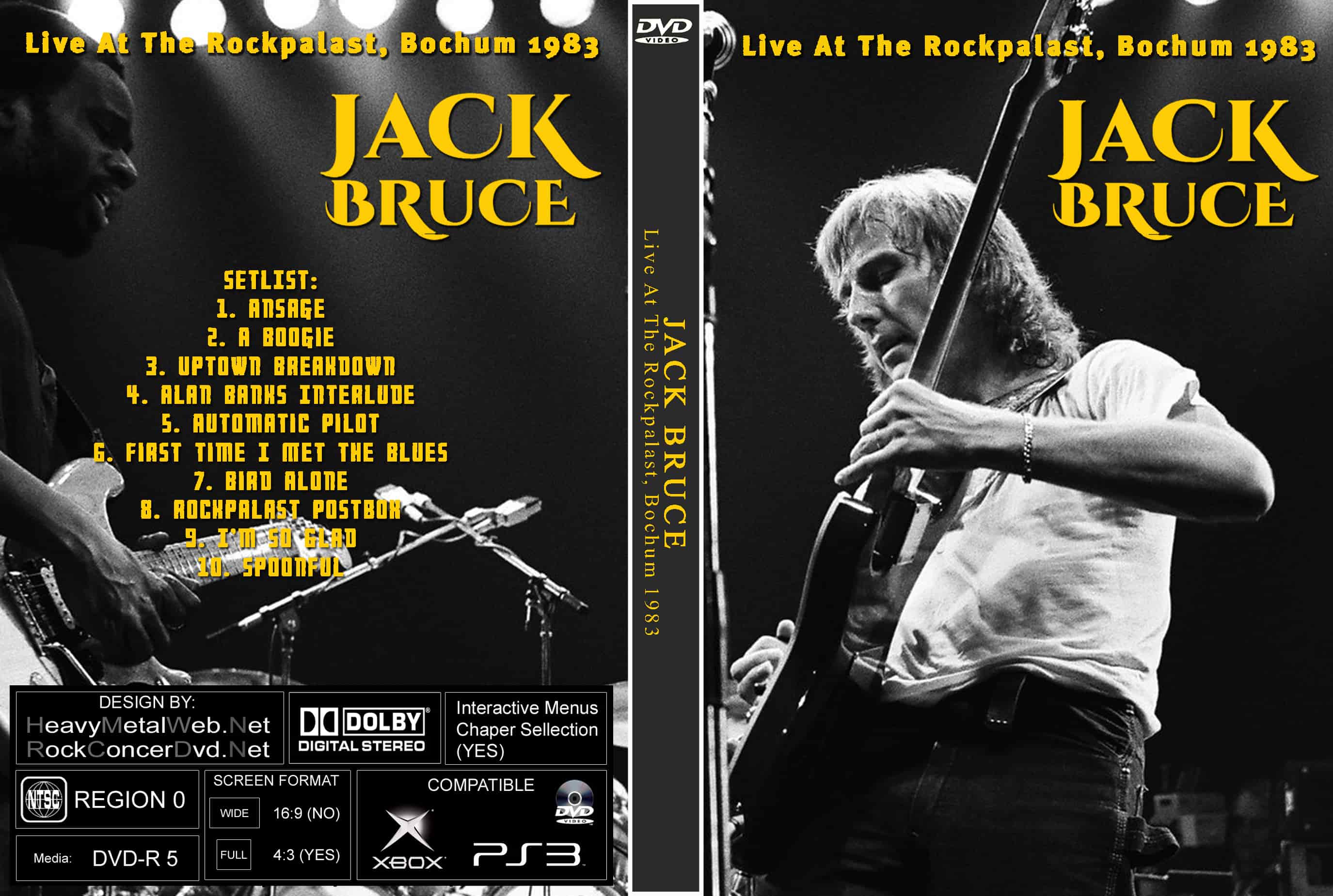 | JACK BRUCE Live At The Rockpalast, Bochum 1983 DVD DVD Format: NTSC Source: Professional Shot (Multi- Camera) Video Quality: Rating: 9.0 Menus: No Chapter Selection: Skip Avery 5 Min WideScreen: Yes HD: Yes Total Running Time: 60 Min. SETLIST: 1. Ansage 2. A Boogie 3. Uptown Breakdown 4. Alan Banks Interlude 5. Automatic Pilot 6. First Time I Met The Blues 7. Bird Alone 8. Rockpalast Postbox 9. I'm So Glad 10. Spoonful |