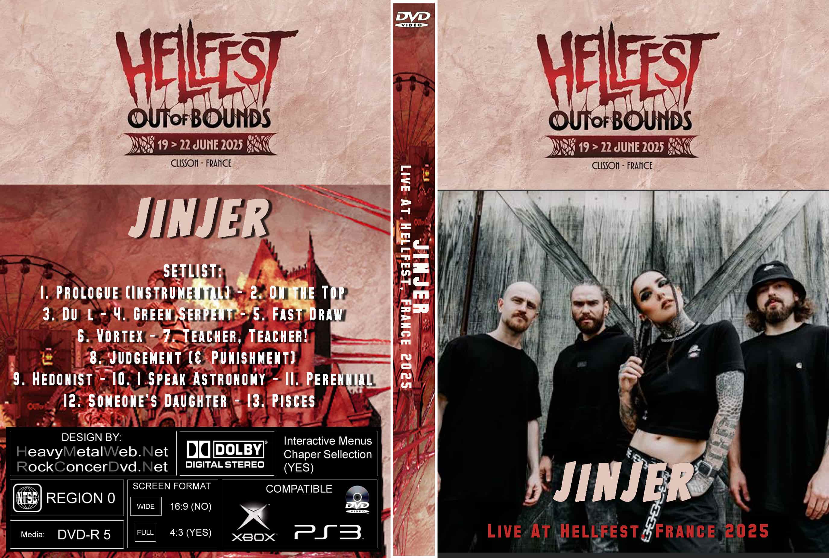 | JINJER Live At Hellfest, France 06-19-2025 DVD DVD Format: NTSC Source: Professional Shot (Multi‑Camera) Video Quality: Rating: 9.0, HD, Widescreen Menus: No Chapter Selection: Every 5 Min. Total Running Time: 60 Min SETLIST: 1. Prologue (Instrumental) 2. On the Top 3. Duél 4. Green Serpent 5. Fast Draw 6. Vortex 7. Teacher, Teacher! 8. Judgement (& Punishment) 9. Hedonist 10. I Speak Astronomy 11. Perennial 12. Someone’s Daughter 13. Pisces |