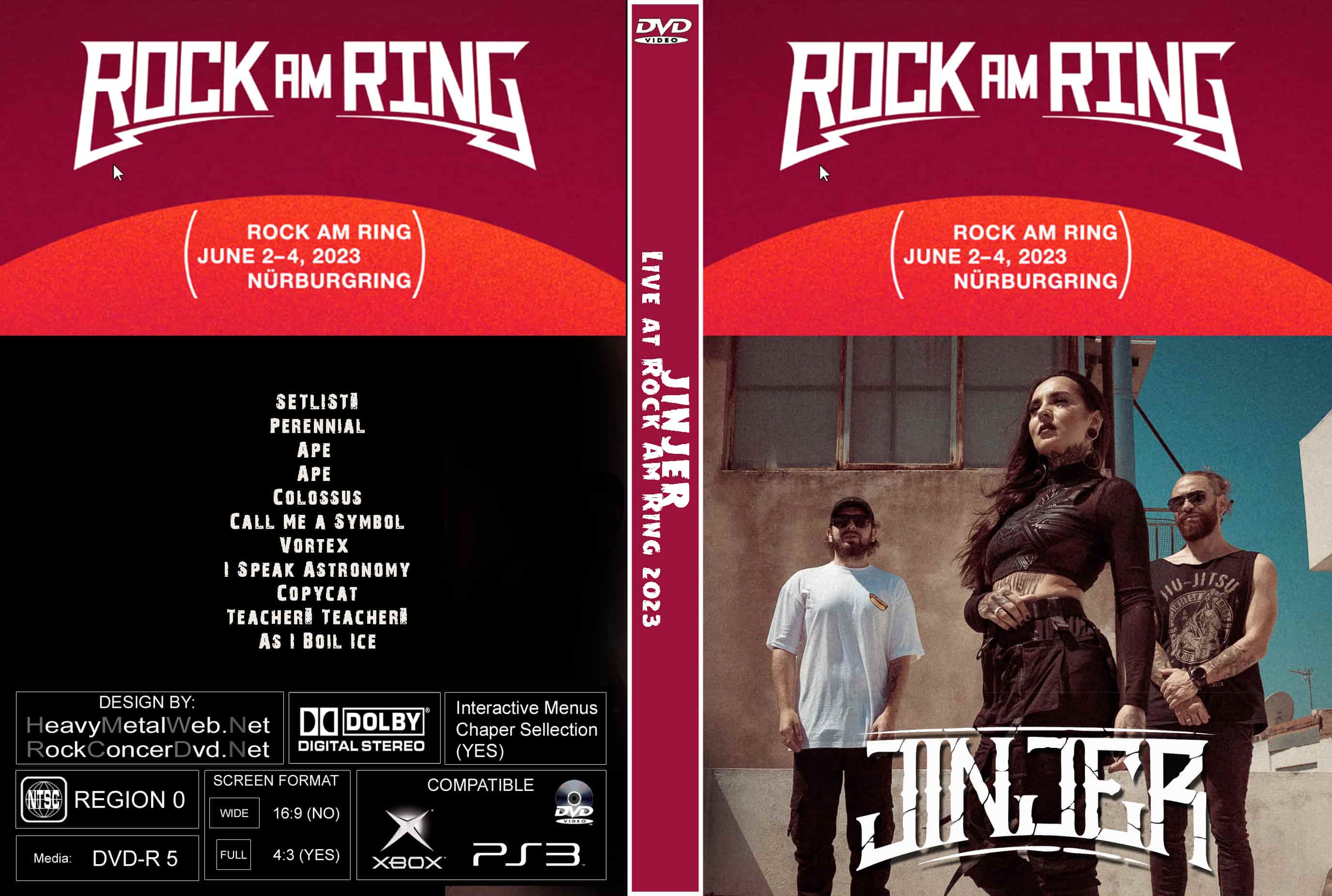 | JINJER Live At The Rock Am Ring 2023 DVD DVD Format: NTSC Source: Professional Shot (Multi- Camera) Video Quality: Rating: 9.0 Menus: Yes Chapter Selection: Every 5 Min WideScreen: Yes HD: Yes Total Running Time: 45 Min. SETLIST: Perennial Ape Ape Colossus Call Me a Symbol Vortex I Speak Astronomy Copycat Teacher, Teacher! As I Boil Ice |
