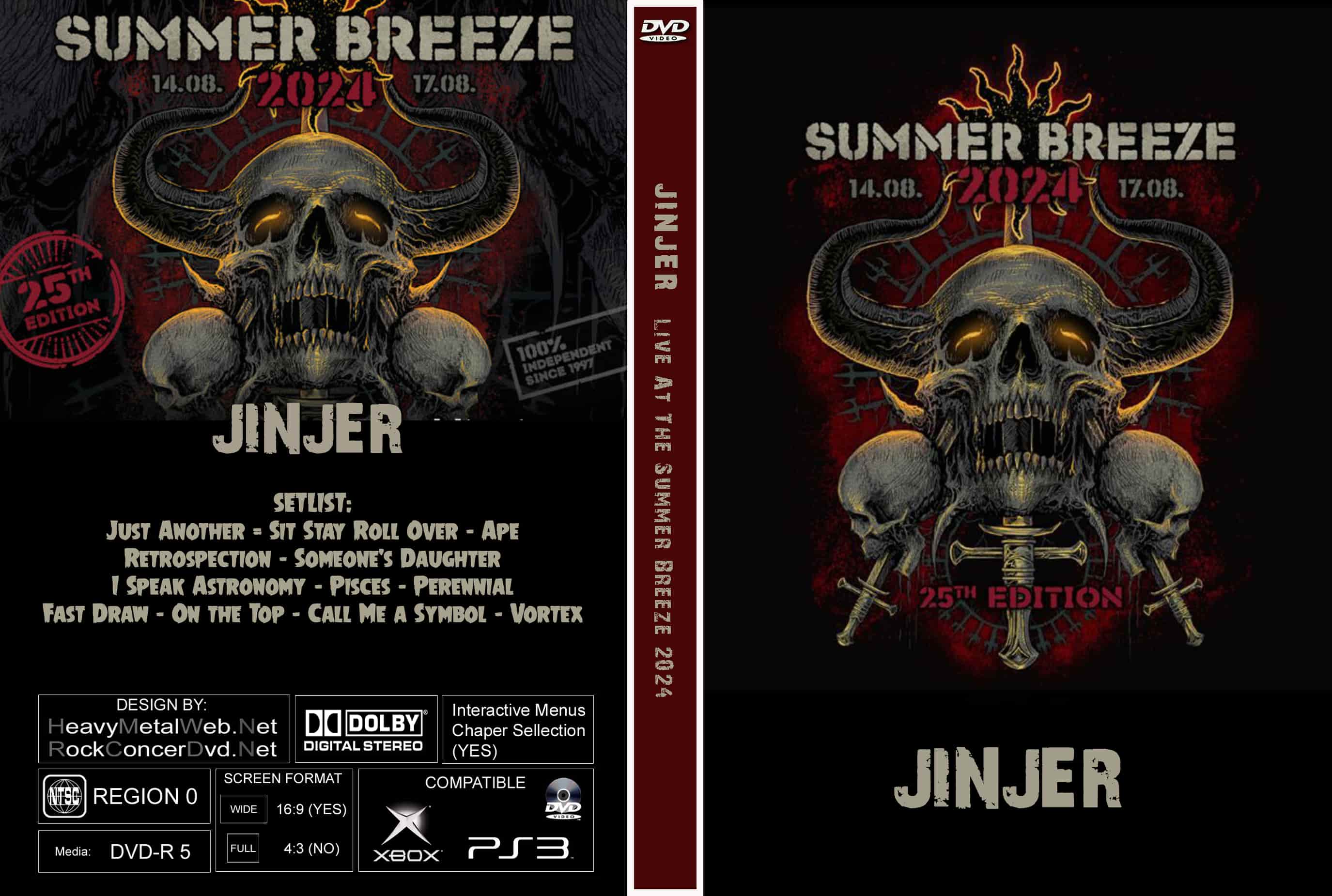 | JINJER Live At The Summer Breeze 2024 DVD DVD Format: NTSC Source: Professional Shot (Multi- Camera) Video Quality: Rating: 9.0 Menus: Yes Chapter Selection: Every 5 Min. WideScreen: Yes HD: Yes Total Running Time: 59 Min. SETLIST: Just Another Sit Stay Roll Over Ape Retrospection Someone's Daughter I Speak Astronomy Pisces Perennial Fast Draw On the Top Call Me a Symbol Vortex |