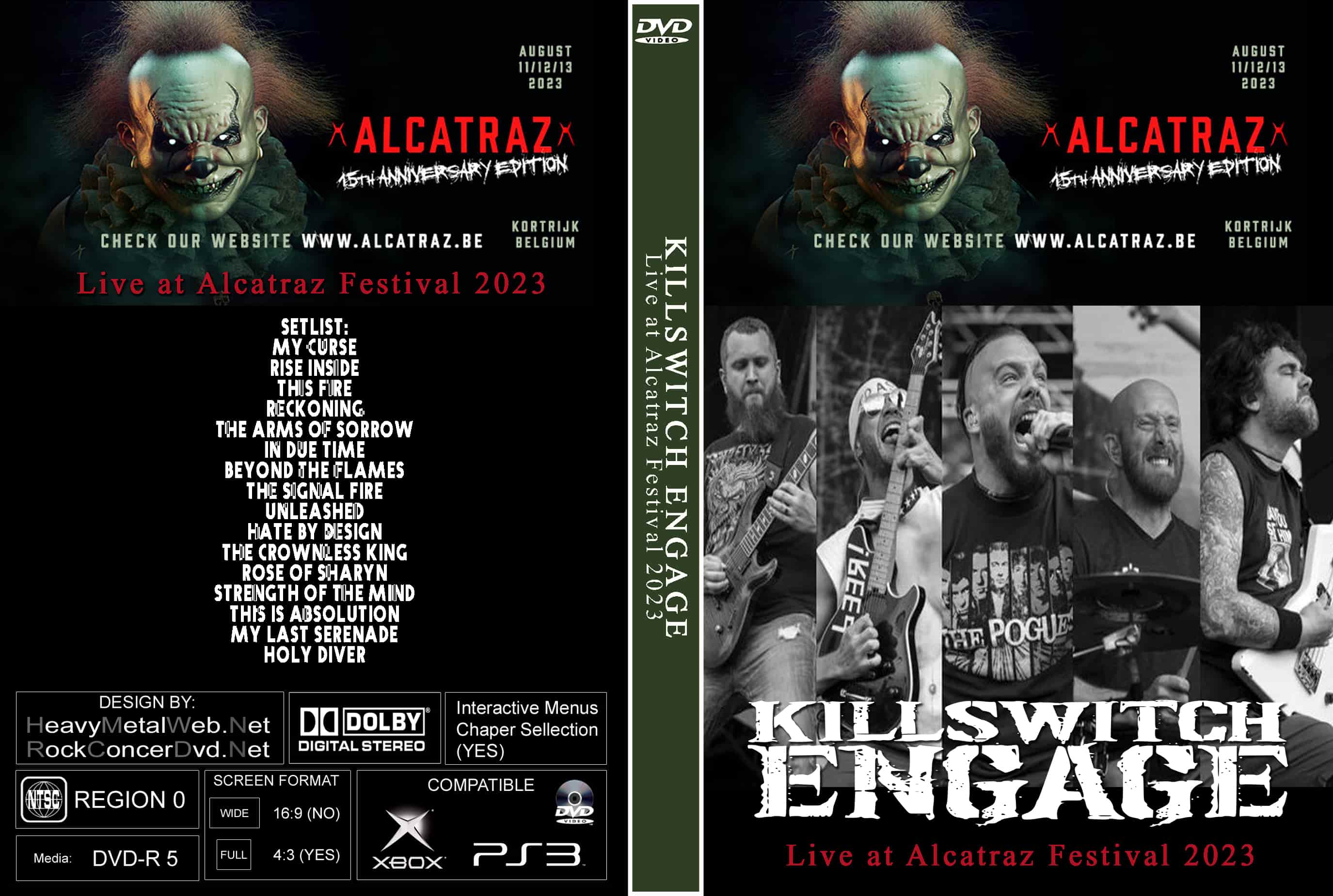 | KILLSWITCH ENGAGE Live at Alcatraz Festival 2023 DVD DVD Format: NTSC Source: Professional Shot (Multi- Camera) Video Quality: Rating: 9.0 Menus: Yes Chapter Selection: Every 5 Min WideScreen: Yes HD: Yes Total Running Time: 64 Min. SETLIST: My Curse Rise Inside This Fire Reckoning The Arms of Sorrow In Due Time Beyond The Flames The Signal Fire Unleashed Hate By Design The Crownless King Rose of Sharyn Strength of The Mind This is Absolution My Last Serenade Holy Diver |