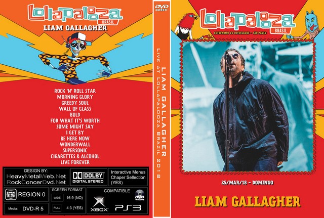 | LIAM GALLAGHER Live at Lollapalooza Brazil 2018 DVD DVD Format: NTSC Source: Pro-Shot (Multi Camera) Video Quality: Rating: 8.5 Menus: Yes Chapter Selection: Yes Widescreen: Yes HD: Yes Total Running Time: 56 Min. SETLIST: Rock ‘n’ Roll Star Morning Glory Greedy Soul Wall of Glass Bold For What It’s Worth Some Might Say I Get By Be Here Now Wonderwall Supersonic Cigarettes & Alcohol Live Forever |