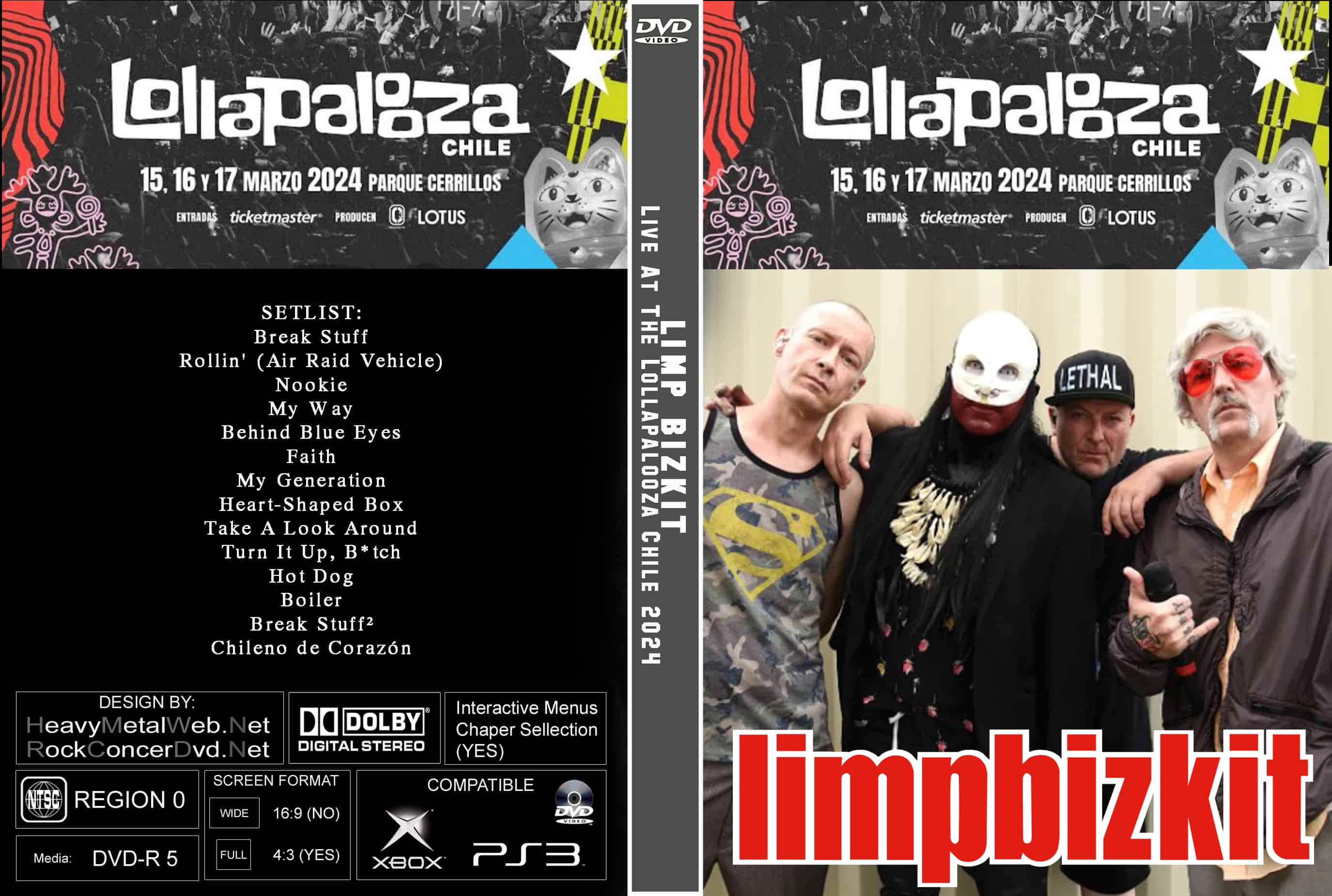 | LIMP BIZKIT Live At Lollapalooza Chile 2024 DVD DVD Format: NTSC Source: Professional Shot (Multi- Camera) Video Quality: Rating: 9.0 Menus: Yes Chapter Selection: Every 5 Min WideScreen: Yes HD: Yes Total Running Time: 60 Min. SETLIST: Break Stuff Rollin' (Air Raid Vehicle) Nookie My Way Behind Blue Eyes Faith My Generation Heart-Shaped Box Take A Look Around Turn It Up, B*tch Hot Dog Boiler Break Stuff² Chileno de Corazón |