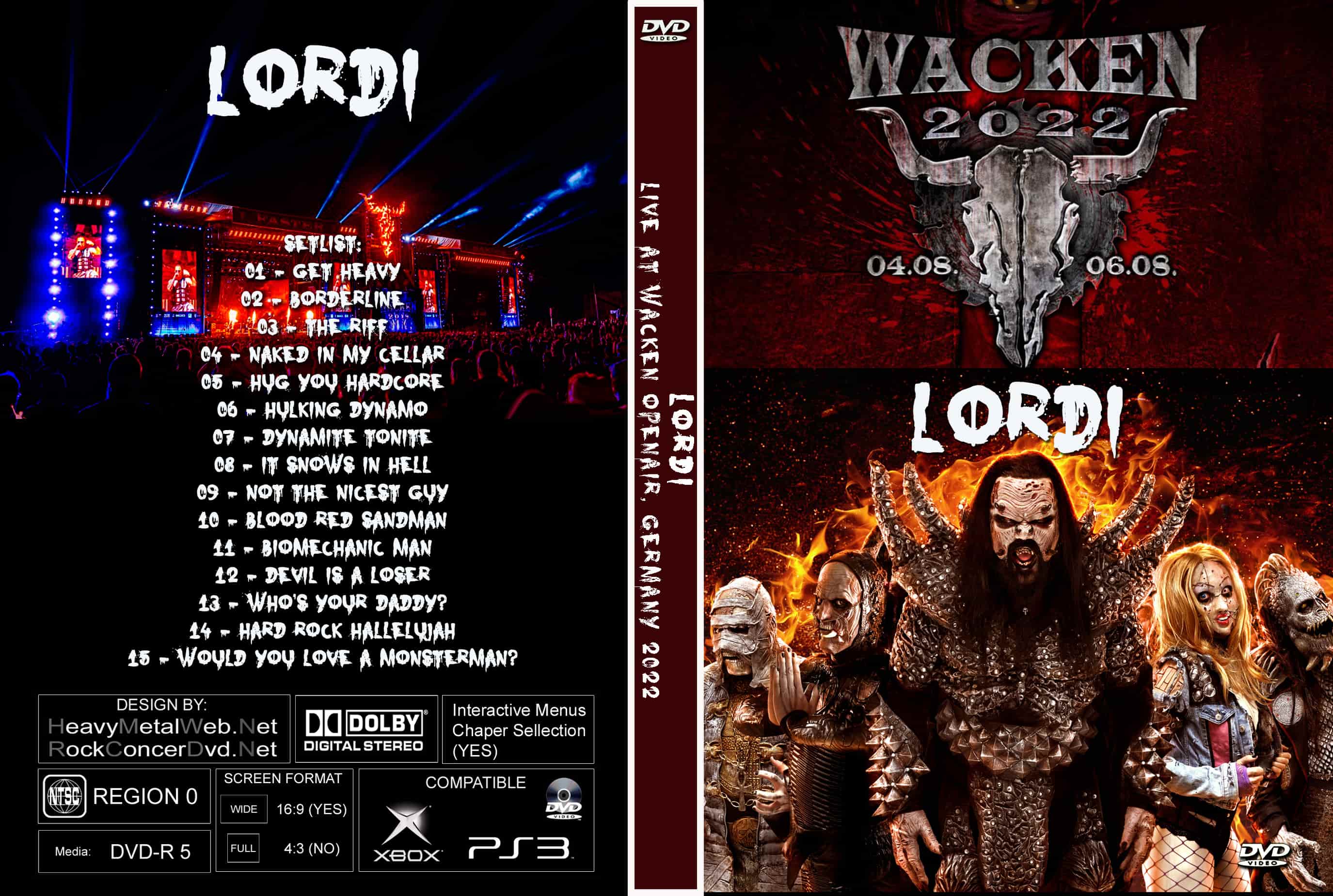 | LORDI Live Wacken Open Air, Germany 2022 DVD DVD Format: NTSC Source: Professional Shot (Multi Camera) Video Quality: Rating: 9.0 Menus: No Chapter Selection: Every 5 Min Widescreen: Yes HD: Yes Total Running Time: 75 Min. SETLIST: 01 - Get Heavy 02 - Borderline 03 - The Riff 04 - Naked in My Cellar 05 - Hug You Hardcore 06 - Hulking Dynamo 07 - Dynamite Tonite 08 - It Snows in Hell 09 - Not the Nicest Guy 10 - Blood Red Sandman 11 - Biomechanic Man 12 - Devil Is a Loser 13 - Who's Your Daddy? 14 - Hard Rock Hallelujah 15 - Would You Love a Monsterman? |