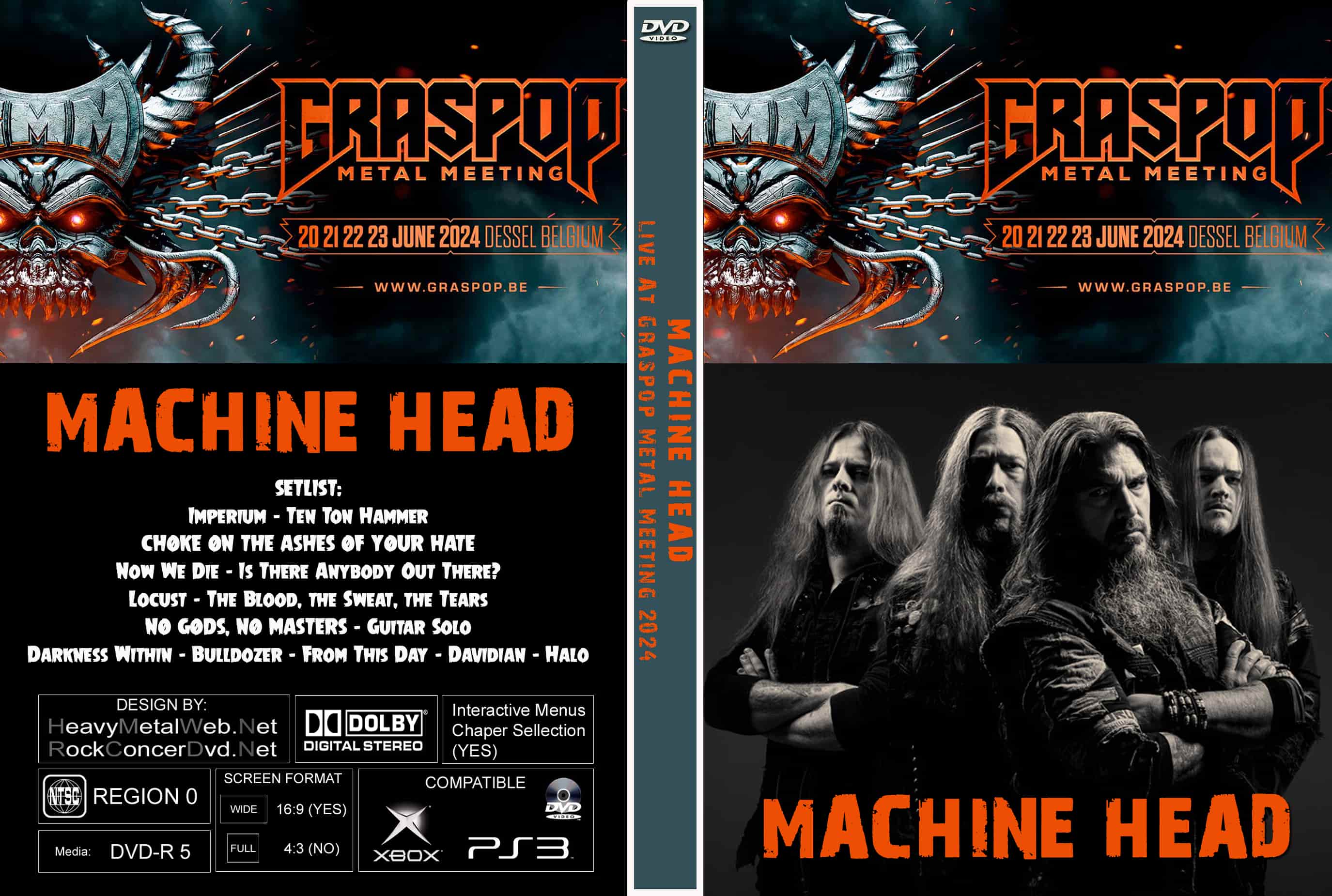 | MACHINE HEAD Live At Graspop Metal Meeting 2024 DVD DVD Format: NTSC Source: Professional Shot (Multi- Camera) Video Quality: Rating: 8.5 Menus: Yes Chapter Selection: Every 5 Min. WideScreen: Yes HD: Yes Total Running Time: 94 Min. SETLIST: Imperium Ten Ton Hammer CHØKE ØN THE ASHES ØF YØUR HATE Now We Die Is There Anybody Out There? Locust The Blood, the Sweat, the Tears NØ GØDS, NØ MASTERS Guitar Solo Darkness Within Bulldozer From This Day Davidian Halo |