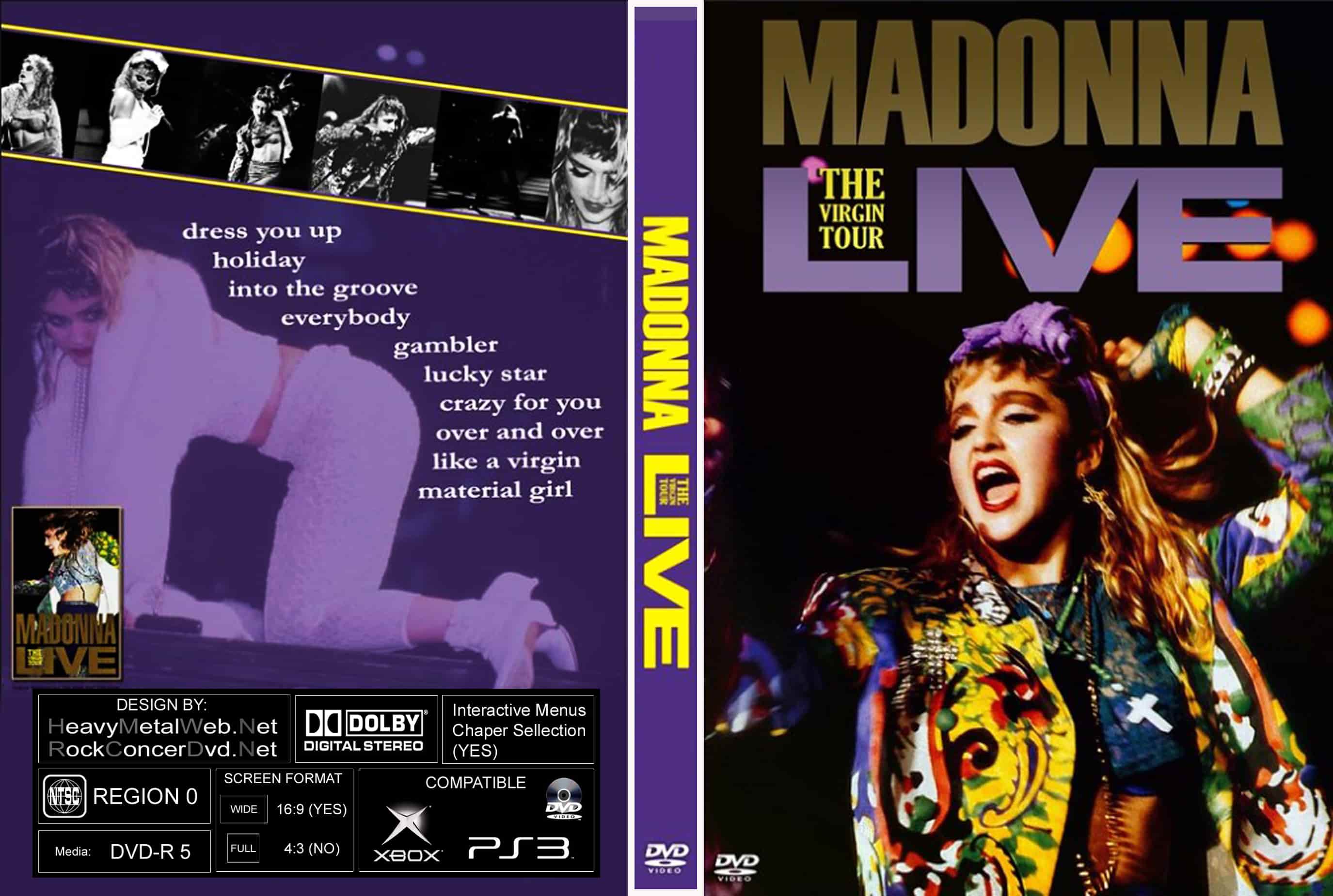 | MADONNA The Virgin Tour 1985 DVD (REMASTERED) DVD Format: NTSC Source: Professional Shot (Multi- Camera) Video Quality: Rating: 9.0 Menus: No Chapter Selection: Every 5 Min Full Screen: Yes HD: No Total Running Time: 53 Min. SETLIST: Dress You Up Holiday Into The Groove Everybody Gambler Lucky Star Crazy For You Over And Over Like A Virgin Material Girl |