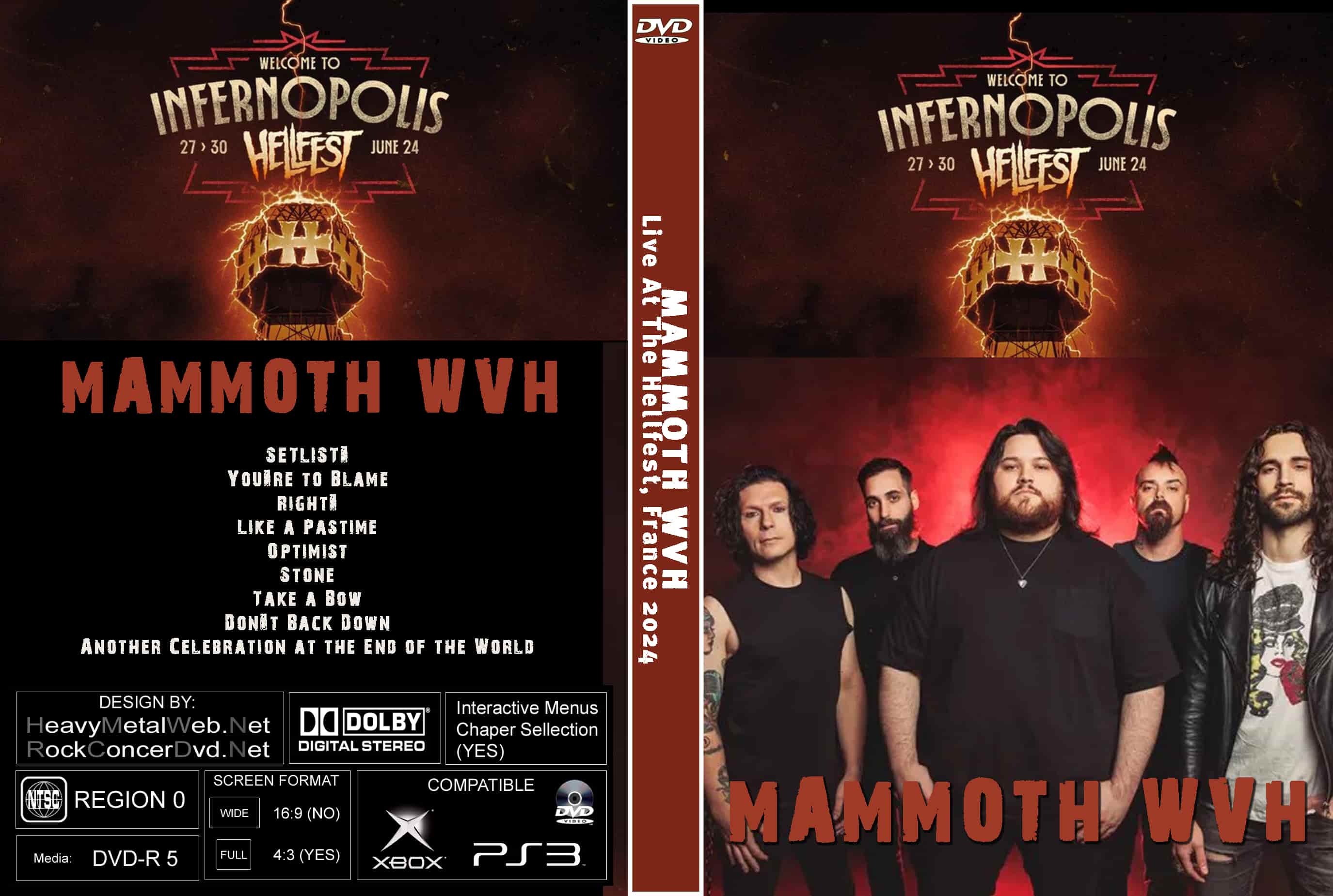 | MAMMOTH WVH Live At The Hellfest, France 2024 DVD DVD Format: NTSC Source: Professional Shot (Multi- Camera) Video Quality: Rating: 9.0 Menus: Yes Chapter Selection: Every 5 Min. WideScreen: Yes HD: Yes Total Running Time: 43 Min. SETLIST: You're to Blame Right? Like a Pastime Optimist Stone Take a Bow Don't Back Down Another Celebration at the End of the World |