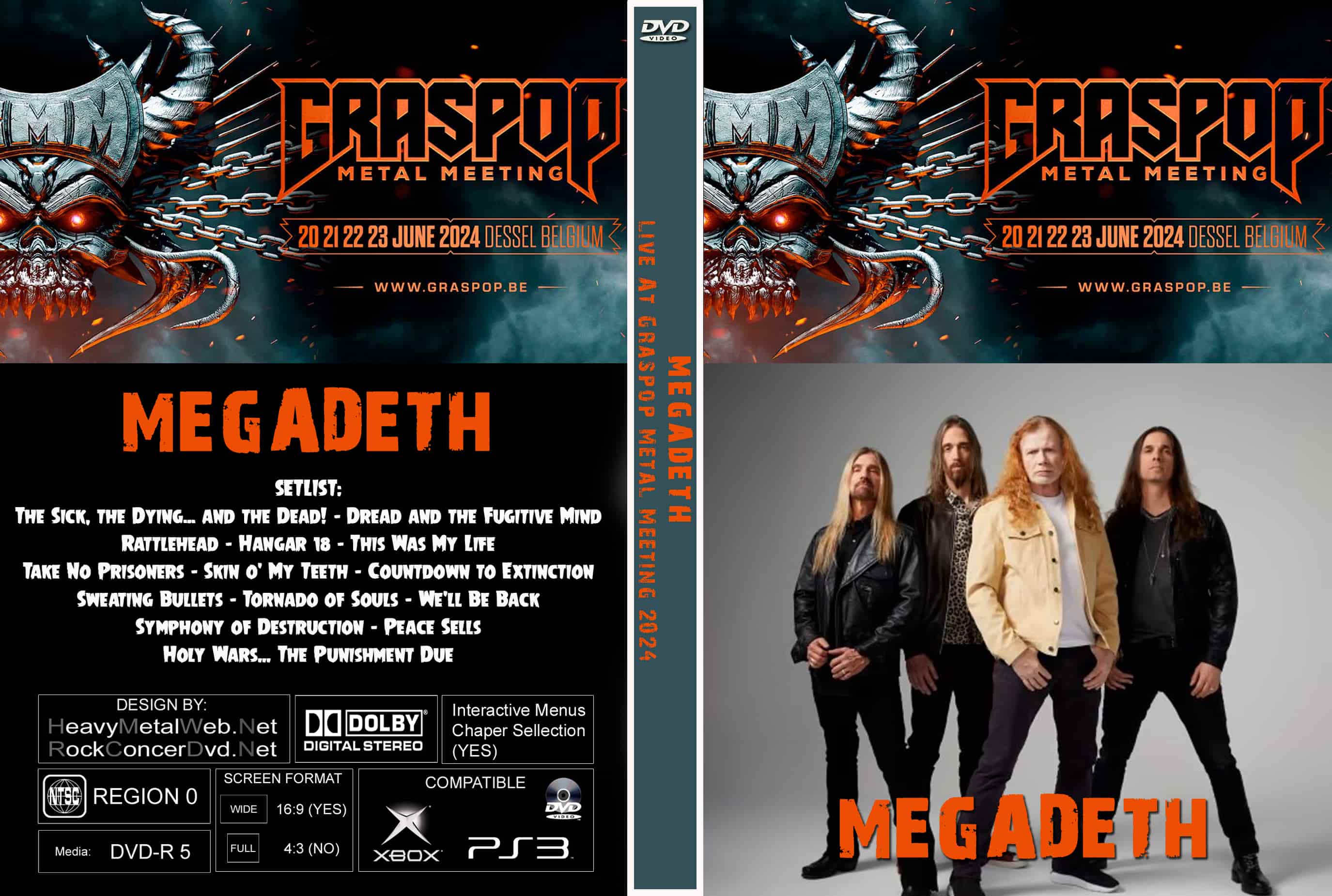 | MEGADETH Live At Graspop Metal Meeting 2024 DVD DVD Format: NTSC Source: Professional Shot (Multi- Camera) Video Quality: Rating: 8.5 Menus: Yes Chapter Selection: Every 5 Min. WideScreen: Yes HD: Yes Total Running Time: 72 Min. SETLIST: The Sick, the Dying… and the Dead! Dread and the Fugitive Mind Rattlehead Hangar 18 This Was My Life Take No Prisoners Skin o' My Teeth Countdown to Extinction Sweating Bullets Tornado of Souls We'll Be Back Symphony of Destruction Peace Sells Holy Wars... The Punishment Due |