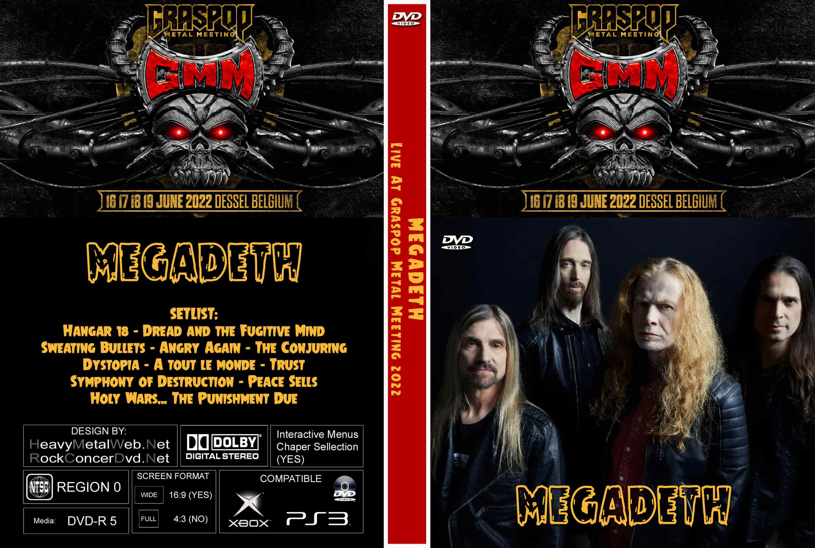 | MEGADETH Live At Graspop Metal Meeting, Belgium 2022 DVD DVD Format: NTSC Source: Professional Shot (Multi Camera) Video Quality: Rating: 7.5 (Web Quality) Menus: No Chapter Selection: Every 5 Min Widescreen: Yes HD: No Total Running Time: 63 Min. SETLIST: Hangar 18 Dread and the Fugitive Mind Sweating Bullets Angry Again The Conjuring Dystopia A tout le monde Trust Symphony of Destruction Peace Sells Holy Wars... The Punishment Due |