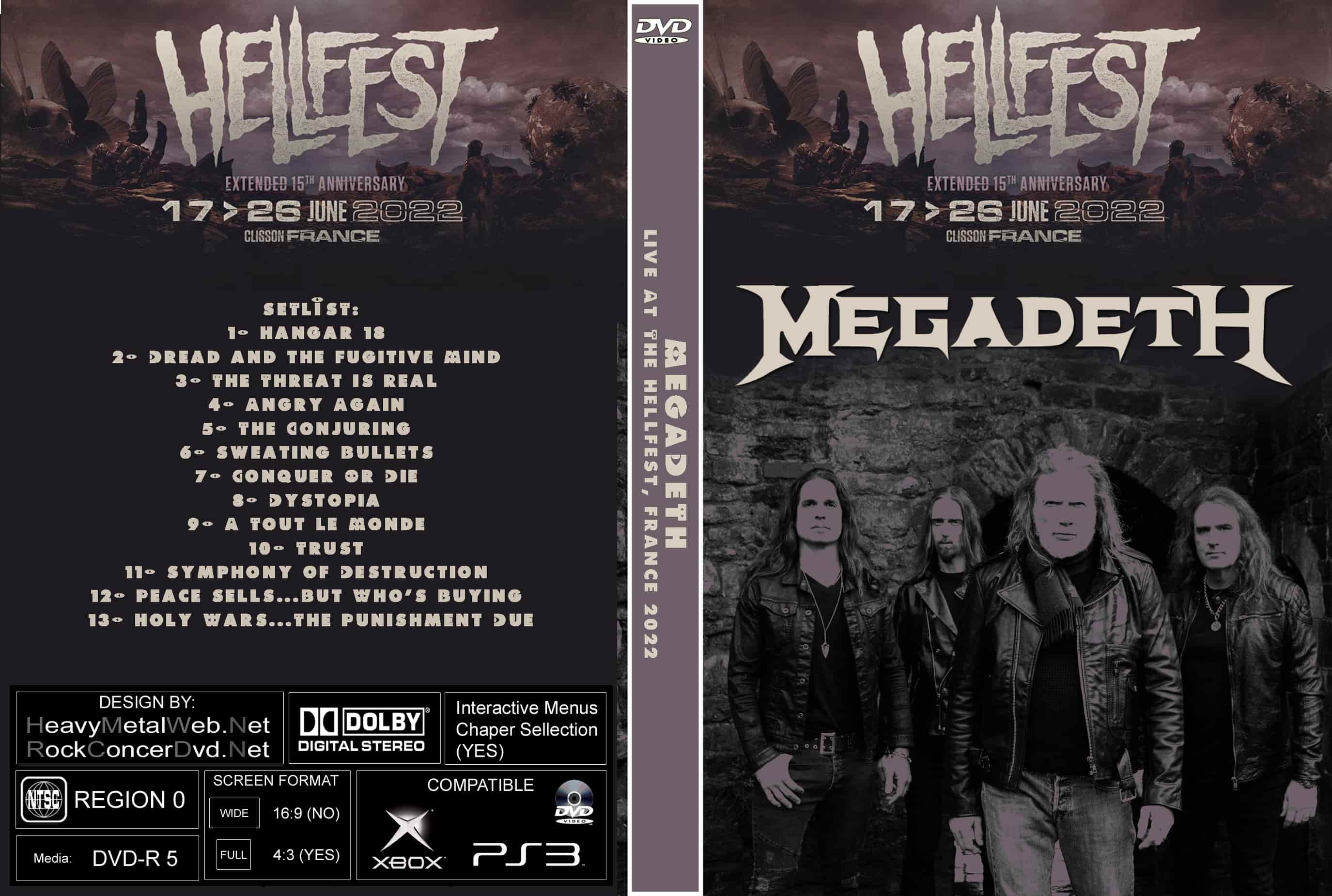| MEGADETH Live At The Hellfest, France 2022 DVD DVD Format: NTSC Source: Professional Shot (Multi Camera) Video Quality: Rating: 9.0 Menus: No Chapter Selection: Every 5 Min Widescreen: Yes HD: Yes Total Running Time: 70 Min. SETLIST: 1- Hangar 18 2- Dread and the Fugitive Mind 3- The Threat is Real 4- Angry Again 5- The Conjuring 6- Sweating Bullets 7- Conquer Or Die 8- Dystopia 9- A Tout Le Monde 10- Trust 11- Symphony of Destruction 12- Peace Sells...But Who's Buying 13- Holy Wars...The Punishment Due |