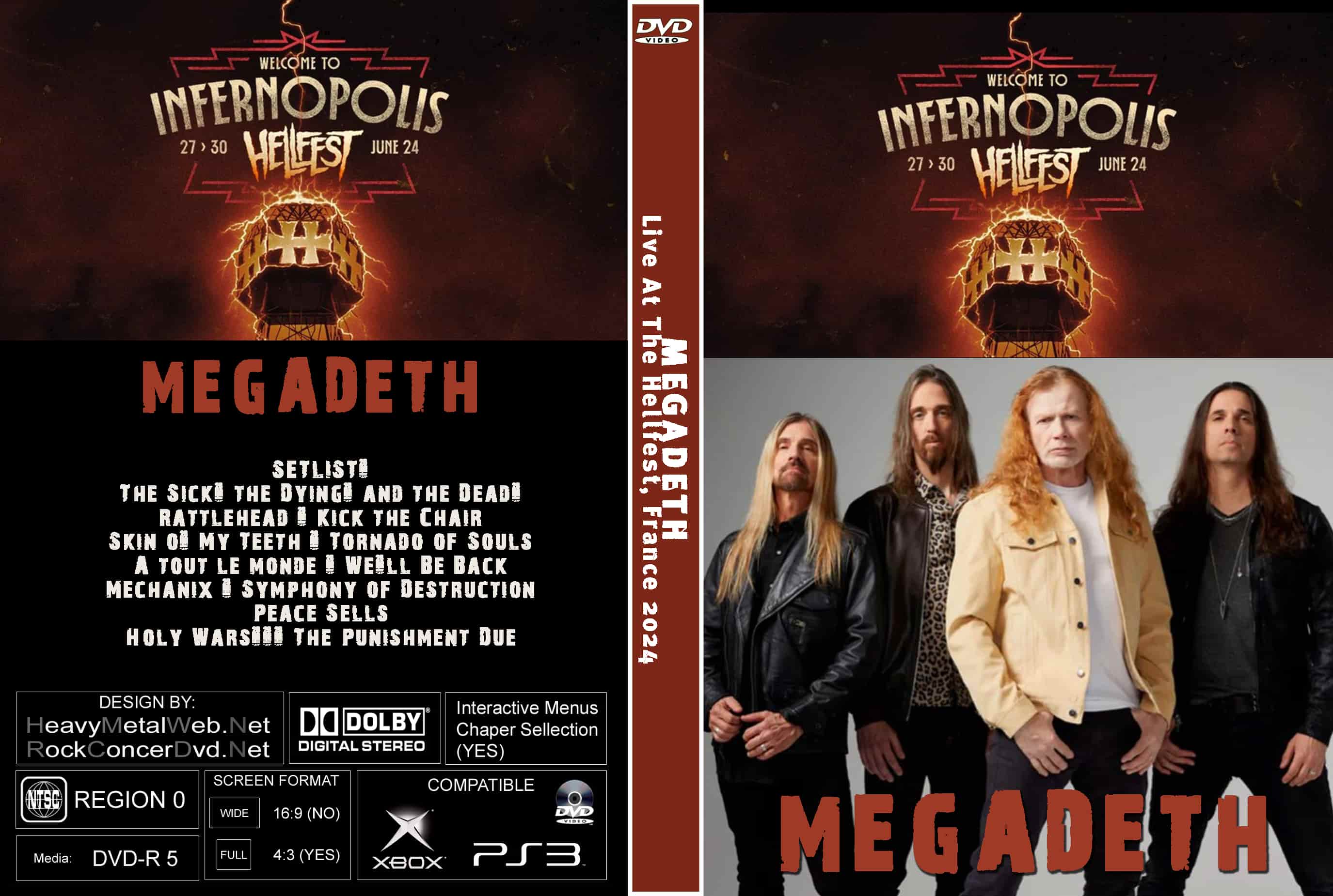 | MEGADETH Live At The Hellfest, France 2024 DVD DVD Format: NTSC Source: Professional Shot (Multi- Camera) Video Quality: Rating: 9.0 Menus: Yes Chapter Selection: Every 5 Min. WideScreen: Yes HD: Yes Total Running Time: 59 Min. SETLIST: The Sick, the Dying… and the Dead! Rattlehead Kick the Chair Skin o' My Teeth Tornado of Souls A tout le monde We'll Be Back Mechanix Symphony of Destruction Peace Sells Holy Wars... The Punishment Due |