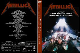 | METALLICA Live At Great Western Forum, Inglewood, CA 02-13-1992 DVD DVD Format: NTSC Source: Professional Shot (Multi Camera) Video Quality: Rating: 9.0 Menus: No Chapter Selection: Every 5 Min Widescreen: Yes HD: Yes Total Running Time: 147 Min. SETLIST: Creeping Death For Whom the Bell Tolls Welcome Home (Sanitarium) Sad but True Wherever I May Roam Harvester of Sorrow Of Wolf and Man Bass Solo The Four Horsemen Leper Messiah The Unforgiven Eye of the Beholder / Blackened / The Frayed Ends of Sanity / ...And Justice for All Guitar Solo Master of Puppets Seek & Destroy (Extended Version) Fade to Black Whiplash Encore: Enter Sandman Through the Never Encore 2: One Last Caress (Misfits cover) Am I Evil? (Diamond Head cover) Damage, Inc. Encore 3: Breadfan |