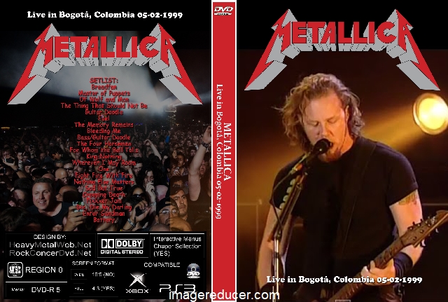 | METALLICA Live in Bogotá, Colombia 05-02-1999 DVD DVD Format: NTSC Source: Professional Shot (Multi Camera) Video Quality: Rating: 8.0 Menus: No Chapter Selection: Every 5 Min Widescreen: No HD: No Total Running Time: 130 Min. SETLIST: Breadfan Master of Puppets Of Wolf and Man The Thing That Should Not Be Guitar Doodle Fuel The Memory Remains Bleeding Me Bass/Guitar Doodle The Four Horsemen For Whom the Bell Tolls King Nothing Wherever I May Roam One Fight Fire With Fire Nothing Else Matters Sad But True Creeping Death Fixxxer Jam Die, Die My Darling Enter Sandman Battery |