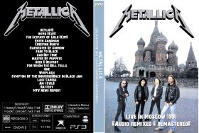 | METALLICA Live in Moscow 1991 (2021) DVD (Audio ReMixed & ReMastered) DVD Format: NTSC Source: Professional Shot (Multi Camera) Video Quality: Rating: 8.0 Menus: No Chapter Selection: Every 5 Min Widescreen: No HD: No Total Running Time: 85 Min. Intro (Cut) The Ecstasy of Gold (Cut) Enter Sandman Creeping Death Harvester Of Sorrow Fade To Black Sad But True Master Of Puppets Seek & Destroy For Whom The Bell Tolls One Whiplash Symptom Of The Universe/Back In Black Jam Last Caress Am I Evil? Battery MTV News Report |