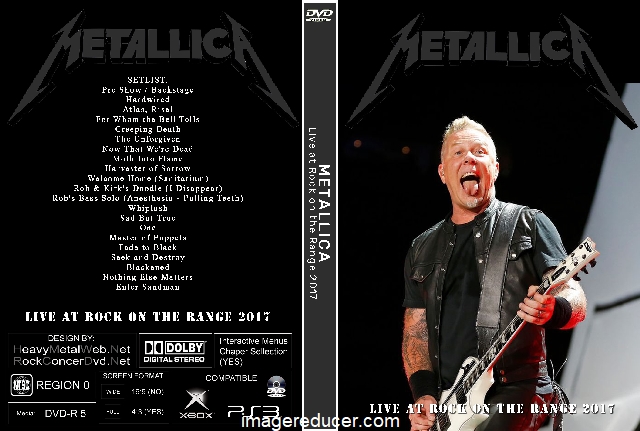 | METALLICA Live at Rock on the Range 2017 (2 DVDs) DVD Format: NTSC Source: Professional Shot (Multi Camera) Video Quality: Rating: 9.0 Menus: No Chapter Selection: Every 5 Min Widescreen: Yes HD: Yes Total Running Time: 136 Min. SETLIST: Pre Show / Backstage Hardwired Atlas, Rise! For Whom the Bell Tolls Creeping Death The Unforgiven Now That We're Dead Moth Into Flame Harvester of Sorrow Welcome Home (Sanitarium) Rob & Kirk's Doodle (I Disappear) Rob's Bass Solo (Anesthesia - Pulling Teeth) Whiplash Sad But True One Master of Puppets Fade to Black Seek and Destroy Blackened Nothing Else Matters Enter Sandman |