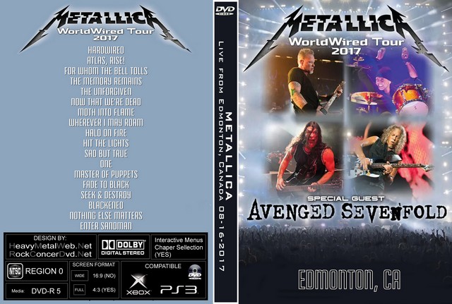 | METALLICA Live from Edmonton, Canada 08-16-2017 (2 DVDs) DVD Format: NTSC Source: Pro-Shot (Multi Camera) Video Quality: Rating: 9.0 Menus: Yes Chapter Selection: Yes Widescreen: Yes HD: Yes Total Running Time: 161 Min. SETLIST: The Ecstasy Of Gold Hardwired Atlas, Rise! For Whom The Bell Tolls The Memory Remains The Unforgiven Now That We're Dead Moth Into Flame Wherever I May Roam Halo On Fire Kirk & Rob I Disappear Jam Rob Anesthesia Solo Hit The Lights Sad But True One Master Of Puppets Fade To Black Seek & Destroy Blackened Nothing Else Matters Enter Sandman |