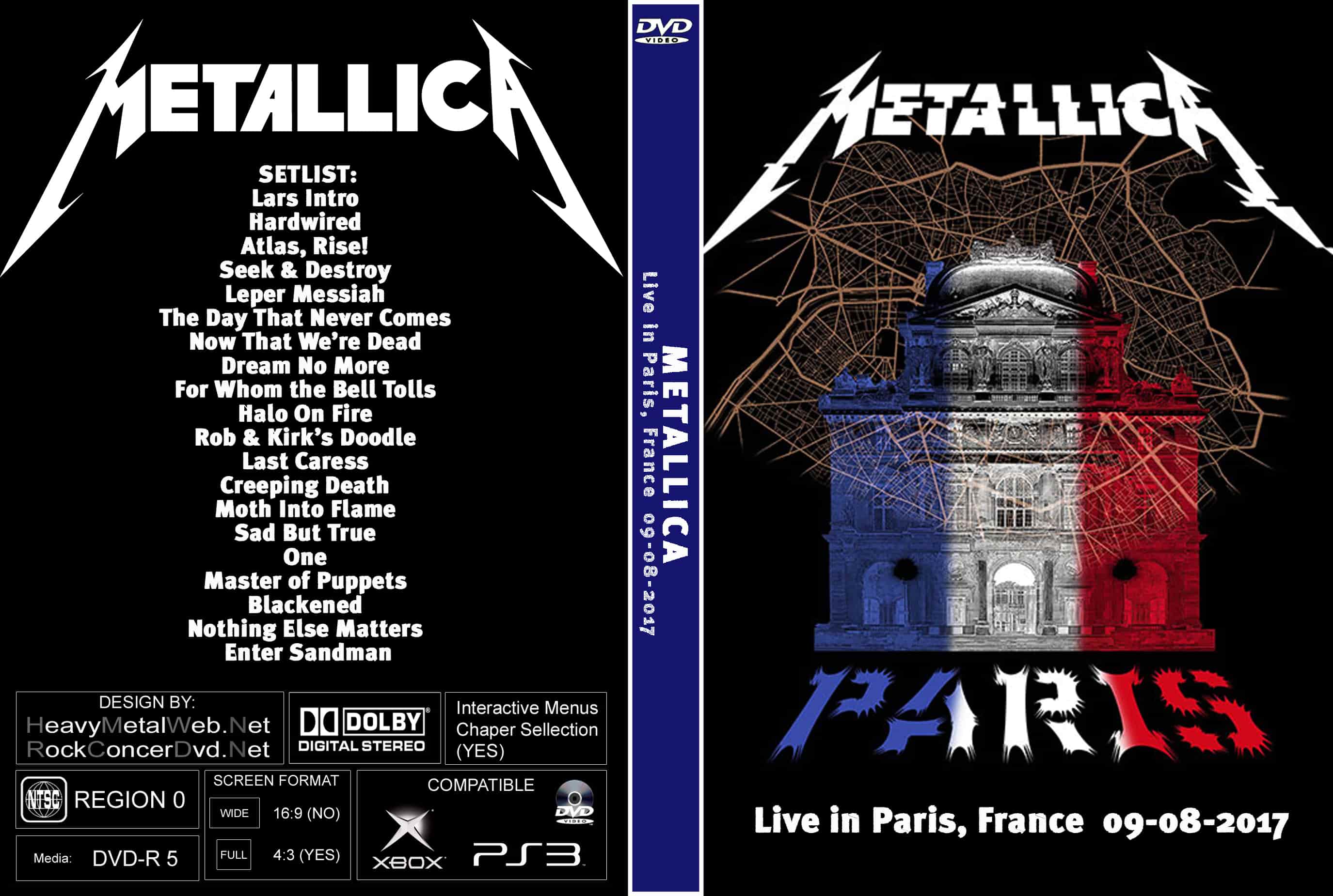 | METALLICA Live in Paris, France 09-08-2017 (2 DVDs) DVD Format: NTSC Source: Professional Shot (Multi Camera) Video Quality: Rating: 9.0 Menus: No Chapter Selection: Every 5 Min Widescreen: Yes HD: Yes Total Running Time: 134 Min. SETLIST: Lars Intro Hardwired Atlas, Rise! Seek & Destroy Leper Messiah The Day That Never Comes Now That We’re Dead Dream No More For Whom the Bell Tolls Halo On Fire Rob & Kirk’s Doodle Last Caress Creeping Death Moth Into Flame Sad But True One Master of Puppets Blackened Nothing Else Matters Enter Sandman |