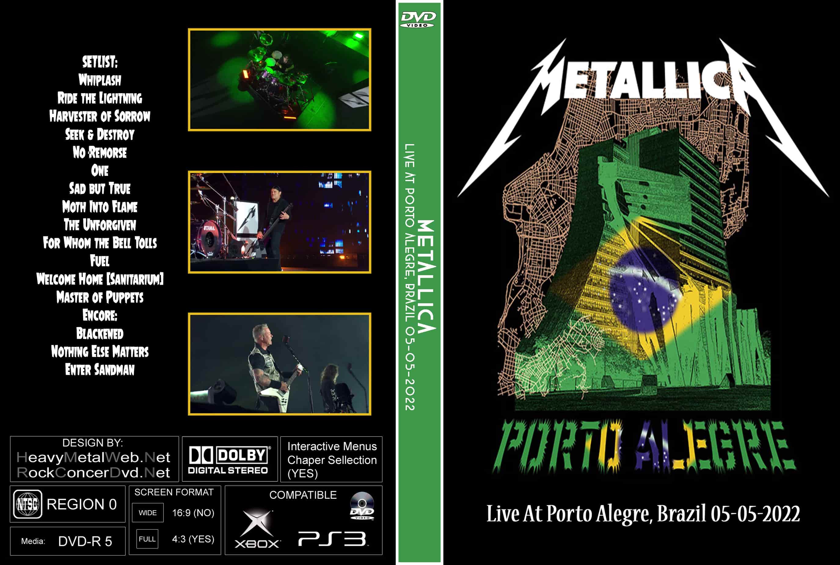 | METALLICA Live At Porto Alegre, Brazil 05-05-2022 (2 DVDs) DVD Format: NTSC Source: Professional Shot (Multi Camera) Video Quality: Rating: 9.0 Menus: No Chapter Selection: Every 5 Min Widescreen: Yes HD: Yes Total Running Time: 118 Min. SETLIST: Whiplash Ride the Lightning Harvester of Sorrow Seek & Destroy No Remorse One Sad but True Moth Into Flame The Unforgiven For Whom the Bell Tolls Fuel Welcome Home (Sanitarium) Master of Puppets Encore: Blackened Nothing Else Matters Enter Sandman |