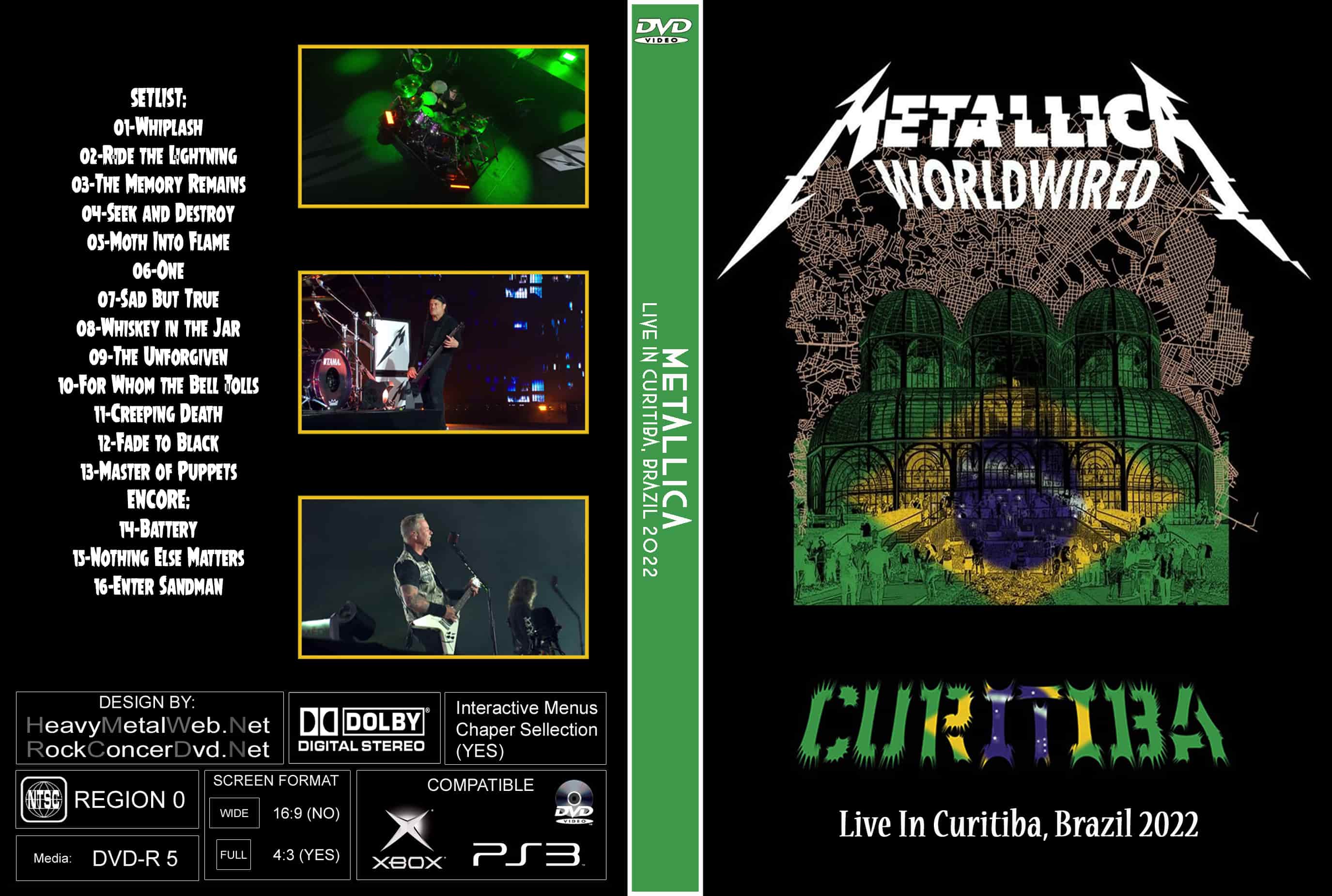| METALLICA Live In Curitiba, Brazil 2022 (2 DVDs) DVD Format: NTSC Source: Professional Shot (Multi Camera) Video Quality: Rating: 9.0 Menus: No Chapter Selection: Every 5 Min Widescreen: Yes HD: Yes Total Running Time: 122 Min. SETLIST: 01-Whiplash 02-Ride the Lightning 03-The Memory Remains 04-Seek and Destroy 05-Moth Into Flame 06-One 07-Sad But True 08-Whiskey in the Jar 09-The Unforgiven 10-For Whom the Bell Tolls 11-Creeping Death 12-Fade to Black 13-Master of Puppets ENCORE: 14-Battery 15-Nothing Else Matters 16-Enter Sandman |
