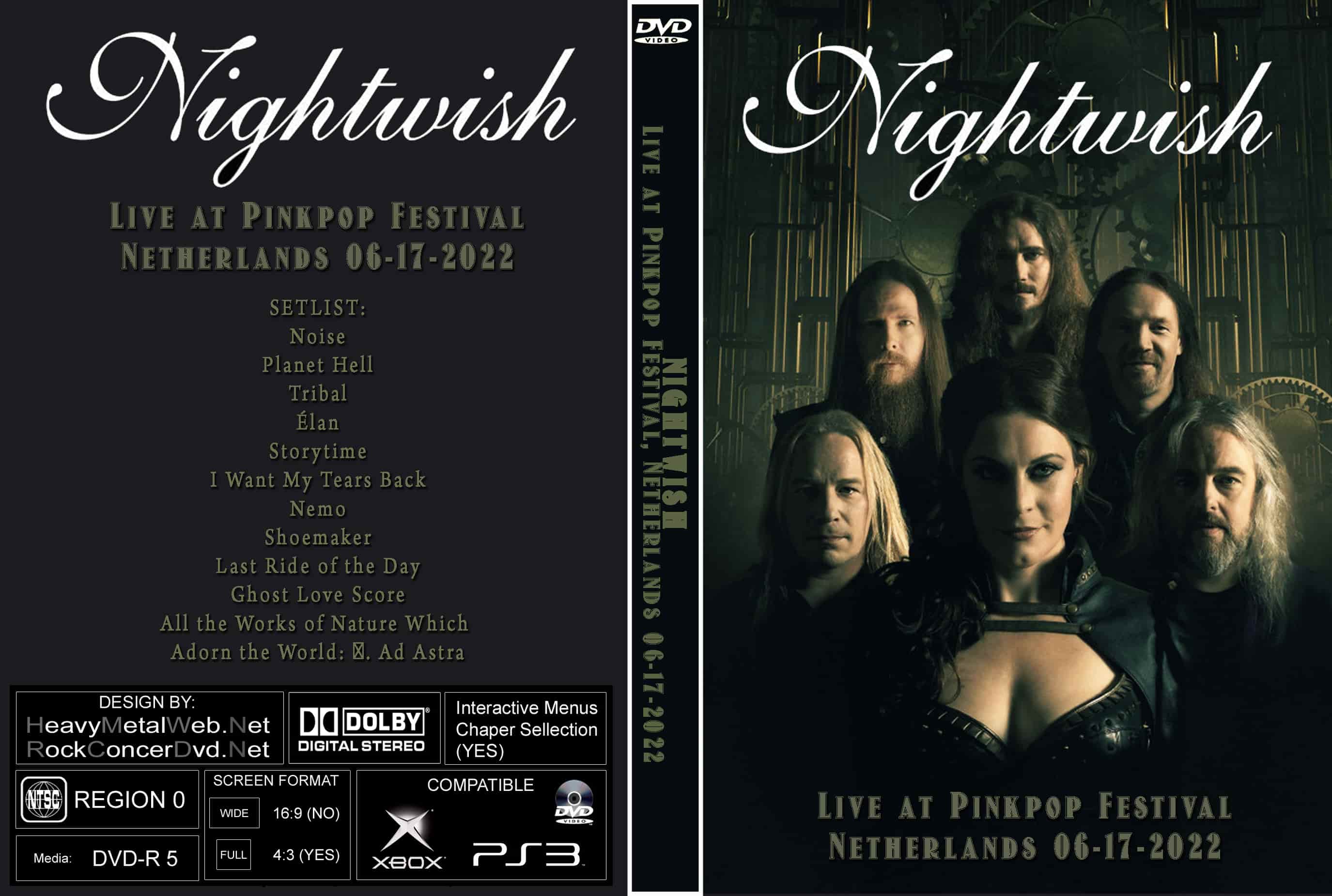 | NIGHTWISH Live at Pinkpop Festival, Netherlands 06-17-2022 DVD DVD Format: NTSC Source: Professional Shot (Multi Camera) Video Quality: Rating: 9.0 Menus: No Chapter Selection: Every 5 Min Widescreen: Yes HD: Yes Total Running Time: 58 Min. SETLIST: Noise Planet Hell Tribal Élan Storytime I Want My Tears Back Nemo Shoemaker Last Ride of the Day Ghost Love Score All the Works of Nature Which Adorn the World: Ⅷ. Ad Astra |