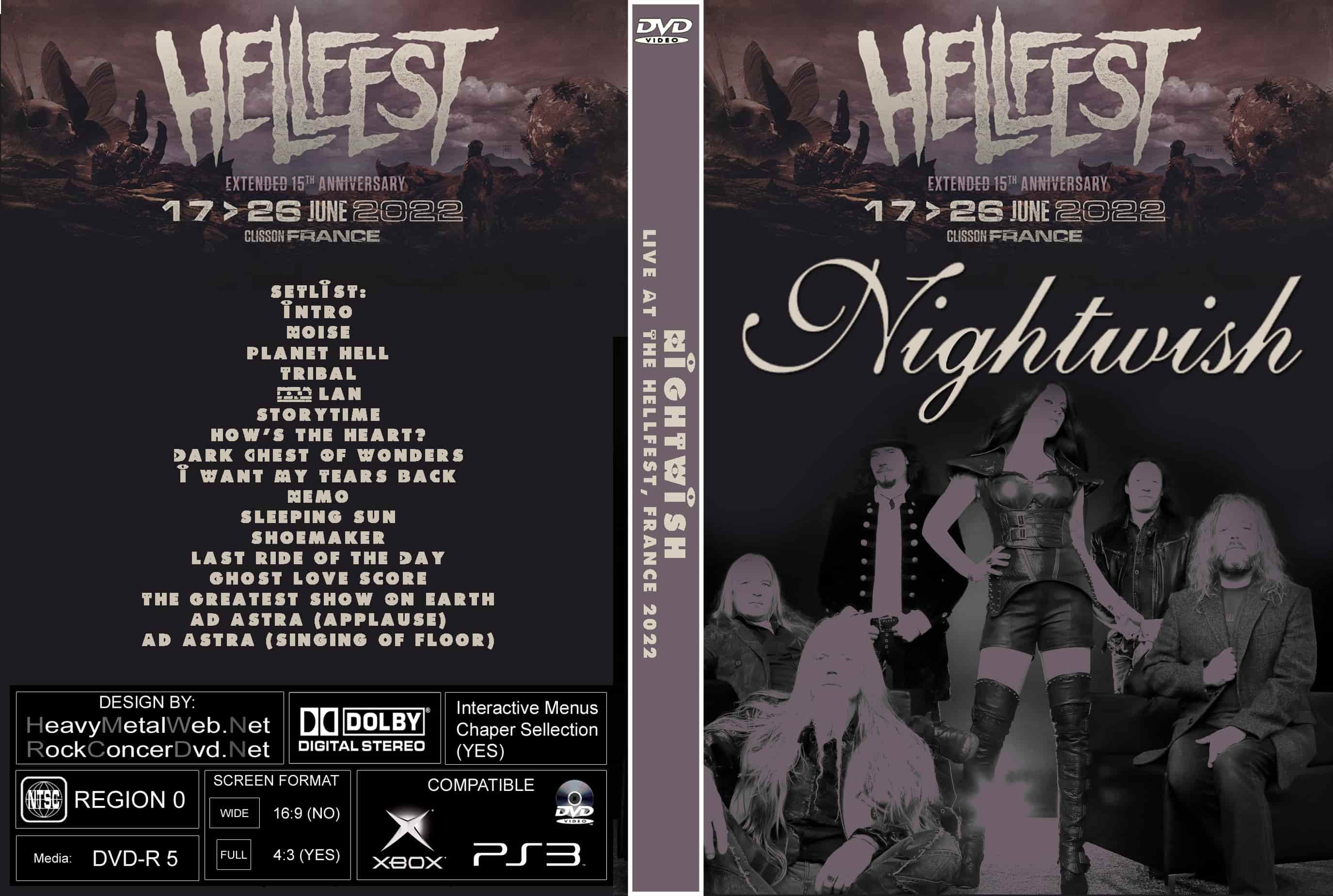 | NIGHTWISH Live At The Hellfest, France 2022 DVD DVD Format: NTSC Source: Professional Shot (Multi Camera) Video Quality: Rating: 9.0 Menus: No Chapter Selection: Every 5 Min Widescreen: Yes HD: Yes Total Running Time: 87 Min. SETLIST: Intro Noise Planet Hell Tribal Élan Storytime How's the Heart? Dark Chest Of Wonders I Want My Tears Back Nemo Sleeping Sun Shoemaker Last Ride of the Day Ghost Love Score The Greatest Show On Earth Ad Astra (applause) Ad Astra (singing of Floor) |
