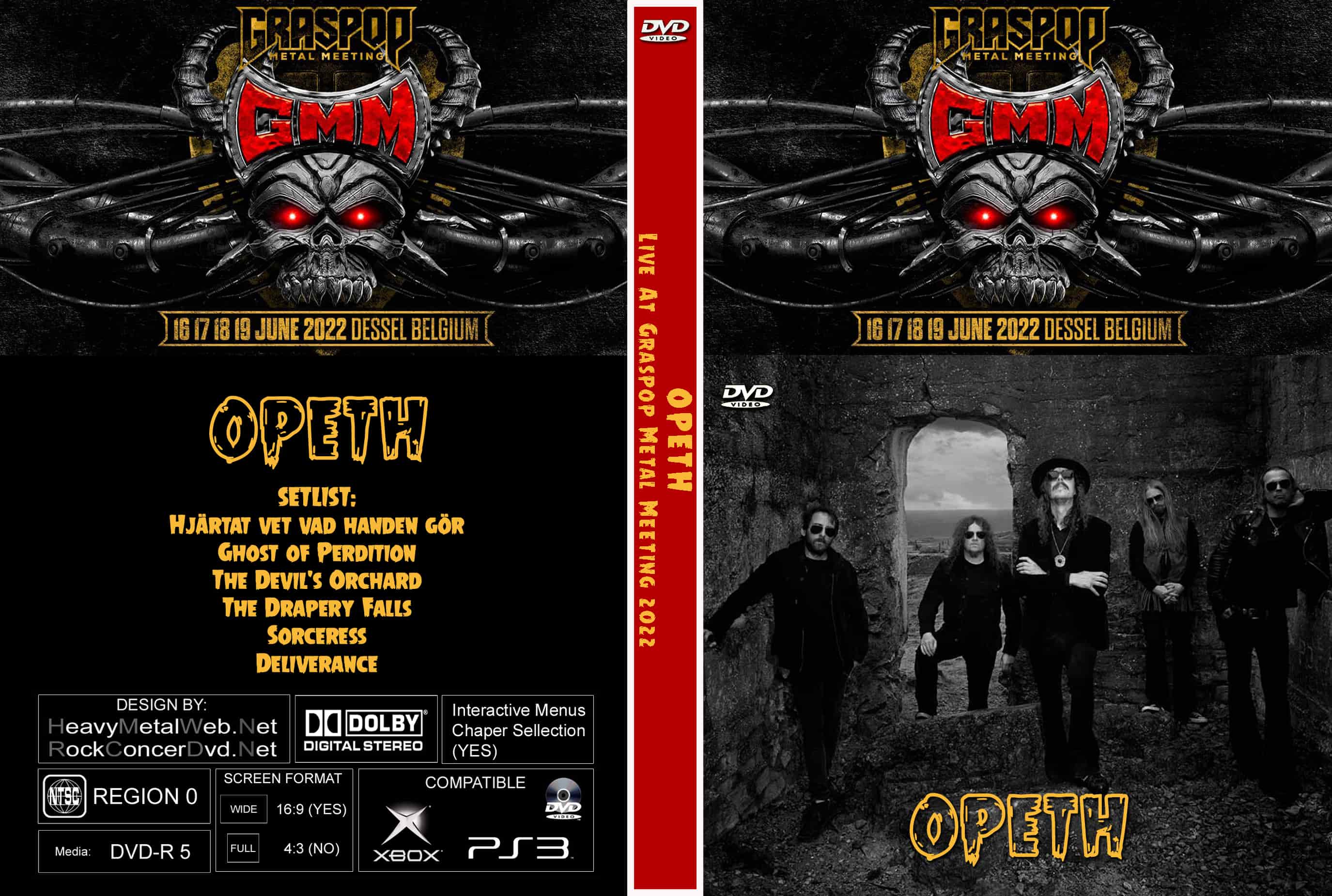 | OPETH Live At Graspop Metal Meeting 2022 DVD DVD Format: NTSC Source: Professional Shot (Multi Camera) Video Quality: Rating: 9.0 Menus: No Chapter Selection: Every 5 Min Widescreen: Yes HD: Yes Total Running Time: 63 Min. SETLIST: Hjärtat vet vad handen gör Ghost of Perdition The Devil's Orchard The Drapery Falls Sorceress Deliverance |